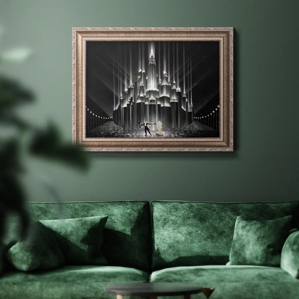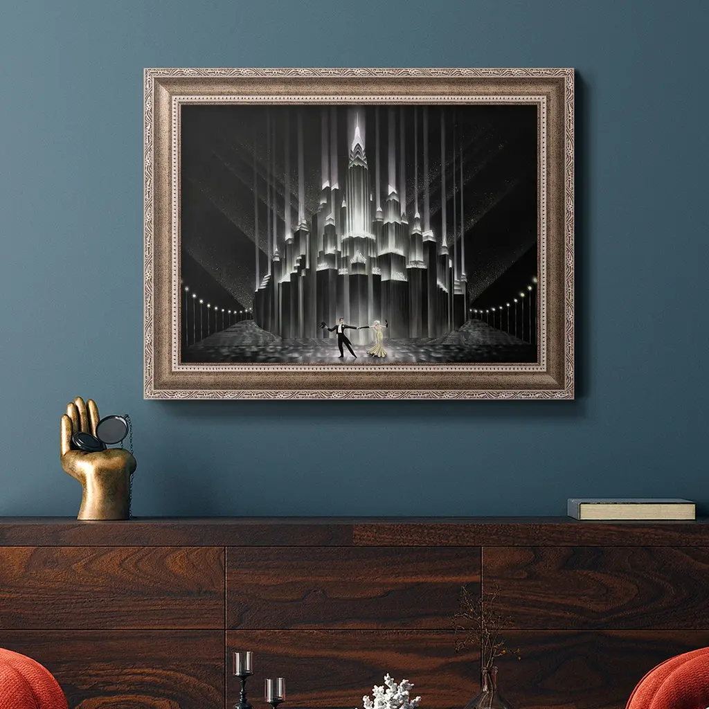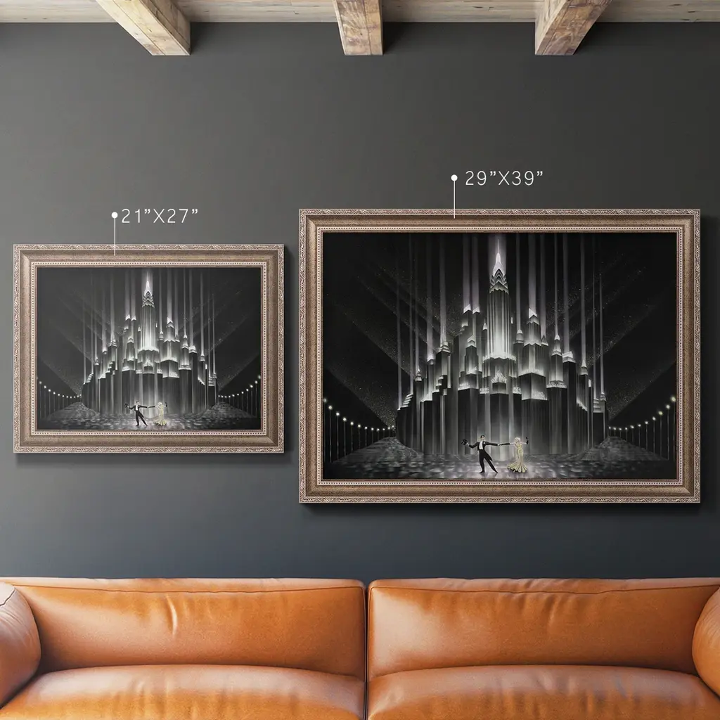Two for Tonight Premium Framed Canvas- Ready to Hang A Premium Framed Canvas created to last. Framed in distressed wood and available in an array of sizes and colors Featuring a beveled a solid wood stretcher bar, each piece comes ready to hand 3 SIZES AVAILABLE 16''X20'' - Overall Size 18'X27'' - Overall Size 24''x36'' - Overall Size Each piece is made to order. Each piece comes with hanging hardware. Made in the USA Ready to Hang Giclee Paper Print Acrylic Glass Beveled Matt Board