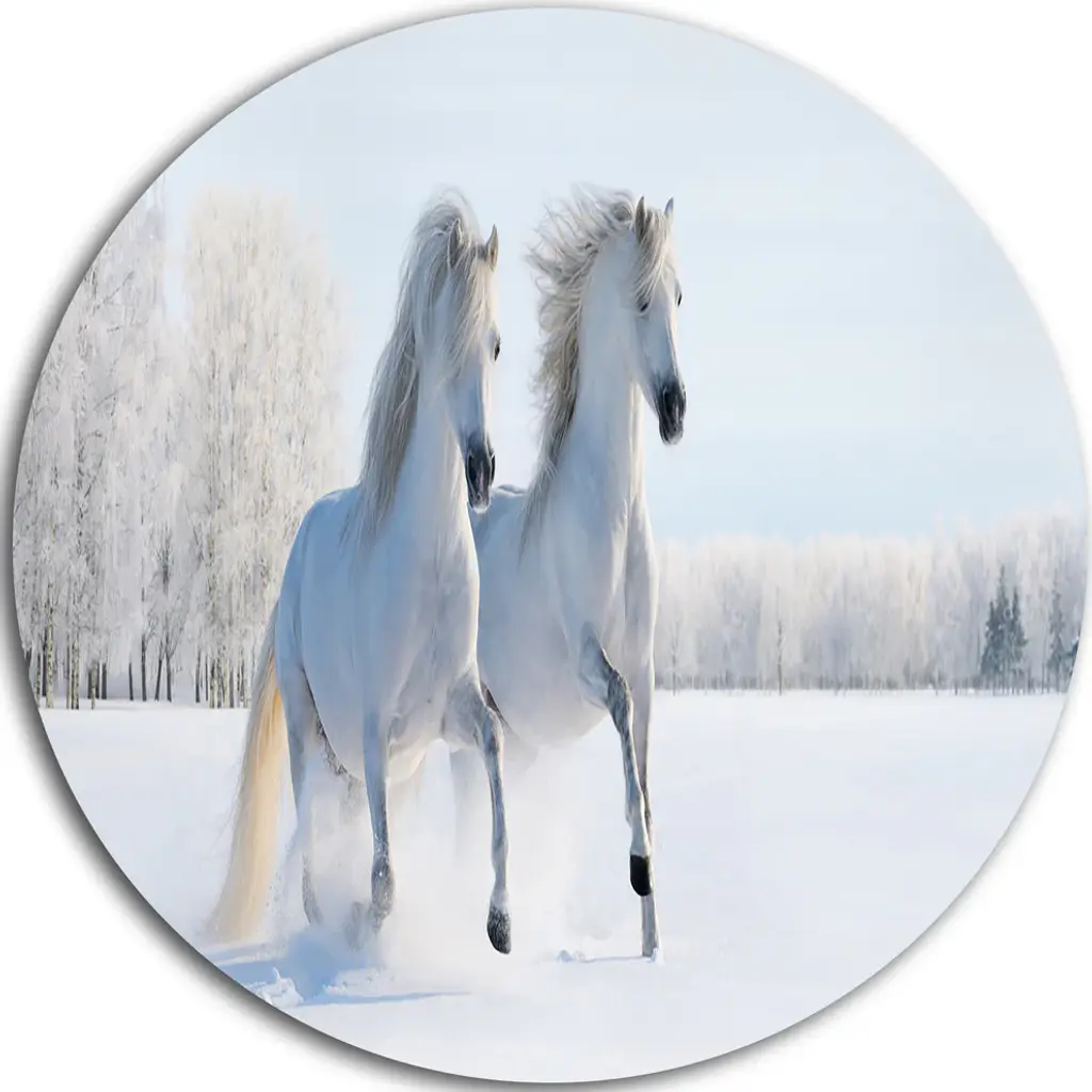 Bring contemporary abstraction to your home with this large 36W x 28H Metal Wall Art. This Two Galloping White Ponies Metal Artwork makes it the focal point of any room or office. - White gloss coating ensures colors are extra vibrant with light reflection.- Aluminum grade sheet metal with 1 inch mounting frame on the back giving the illusion that the artwork is floating on the wall..- Mounting brackets are included along with instructions.- High quality digital images are created directly into a glossy aluminum panel producing a stunning and captivating print into the glossy finish of the metal.- Water, fire and scratch resistant HD aluminum panels.- Looks better than any photo paper and guaranteed to last at least 20 years- Easy to clean with a microfiber cloth. Colors are far superior to regular canvas art. - Easy to hang