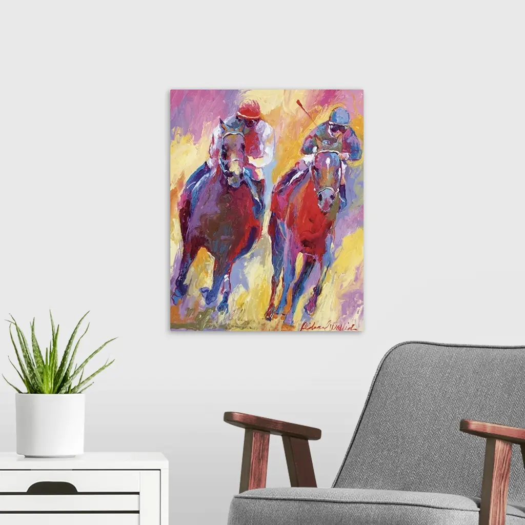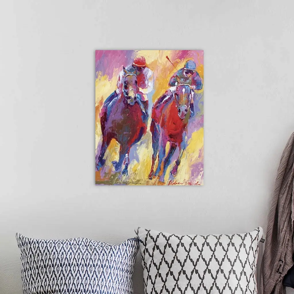 Contemporary vibrant colorful painting of a jockey on horseback.