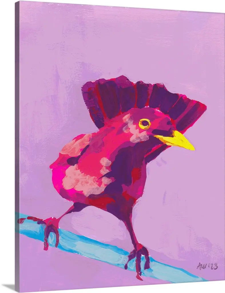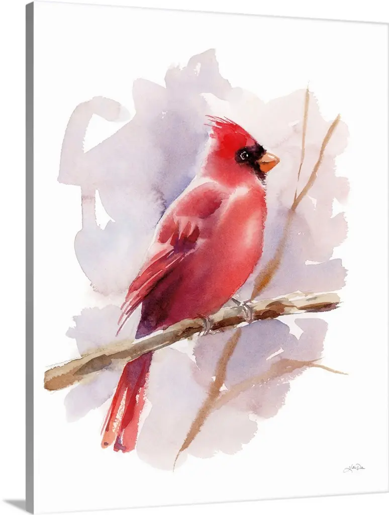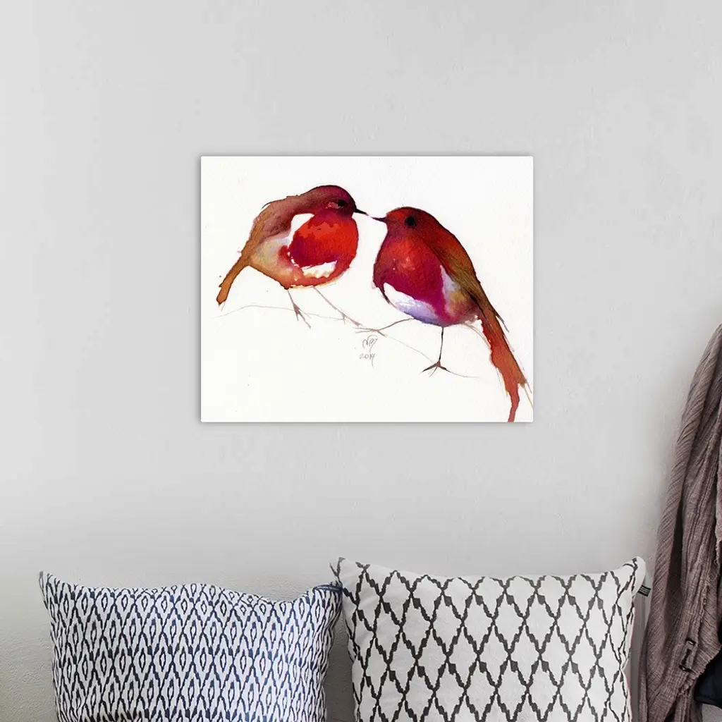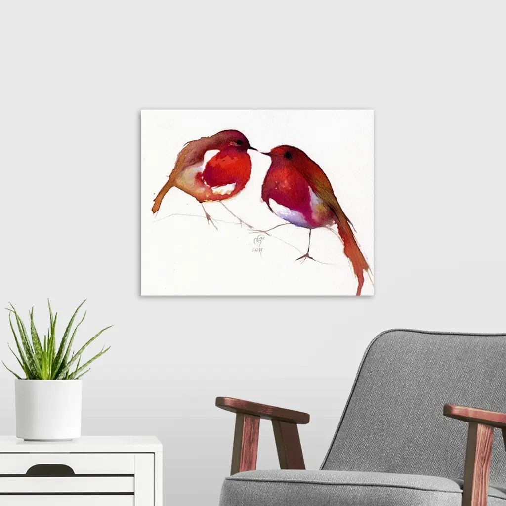 Contemporary artwork of two bright red birds against a white background.
