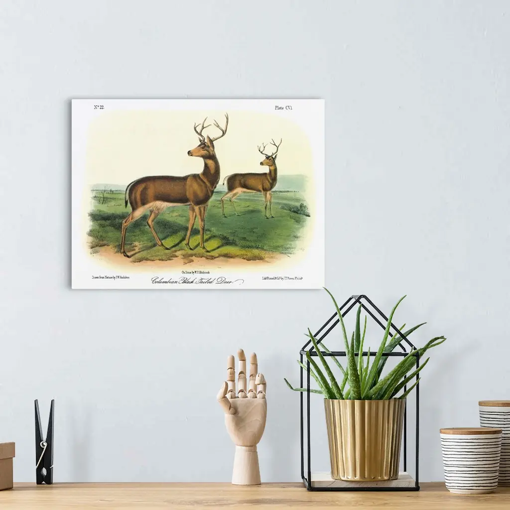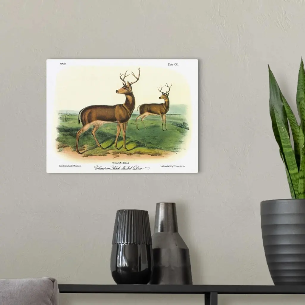 Two male Columbian black-tailed deer (Odocoileus hemionus columbianus), a subspecies of the mule deer. Lithograph, c1854, after a painting by John Woodhouse Audubon for John James Audubon's 'Viviparous Quadrupeds of North America.'
