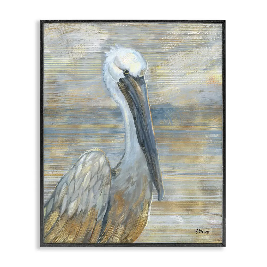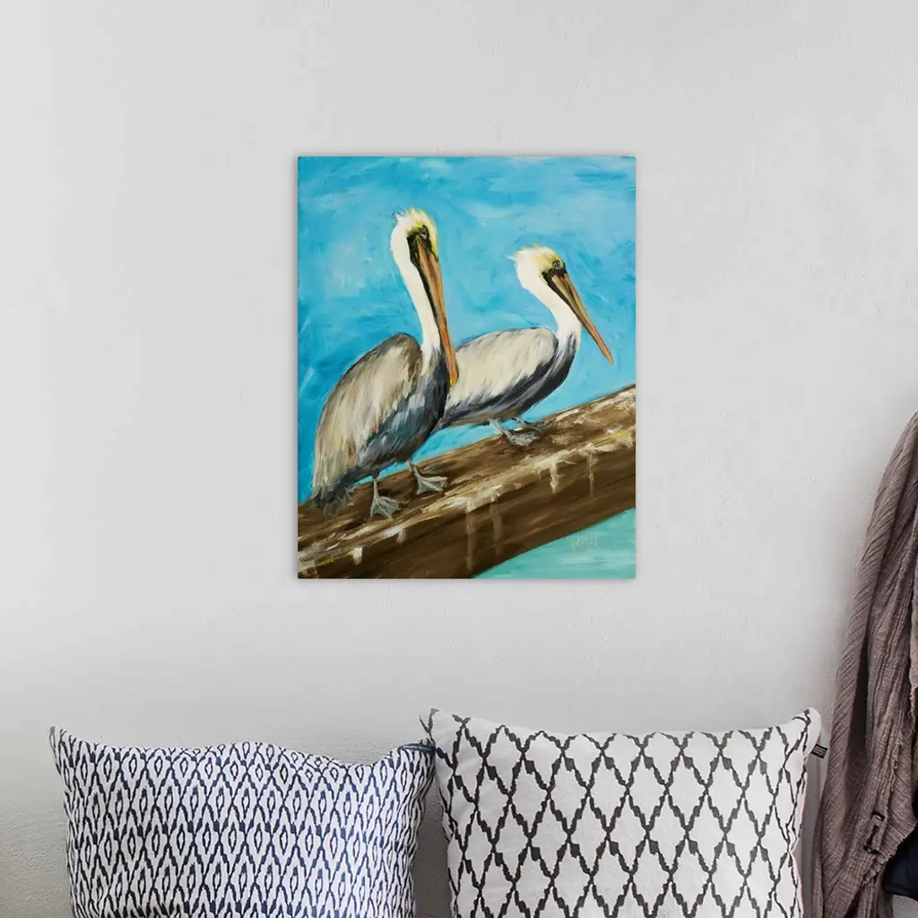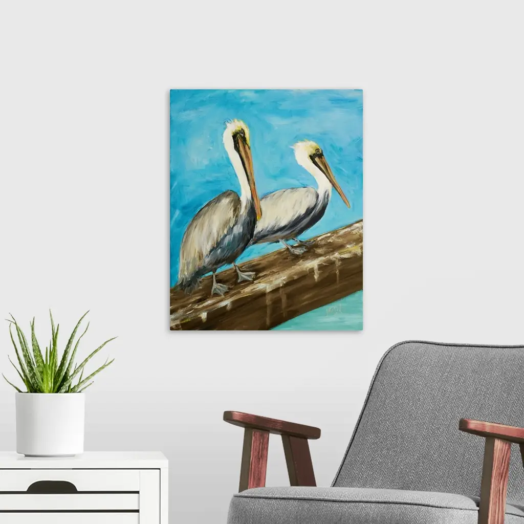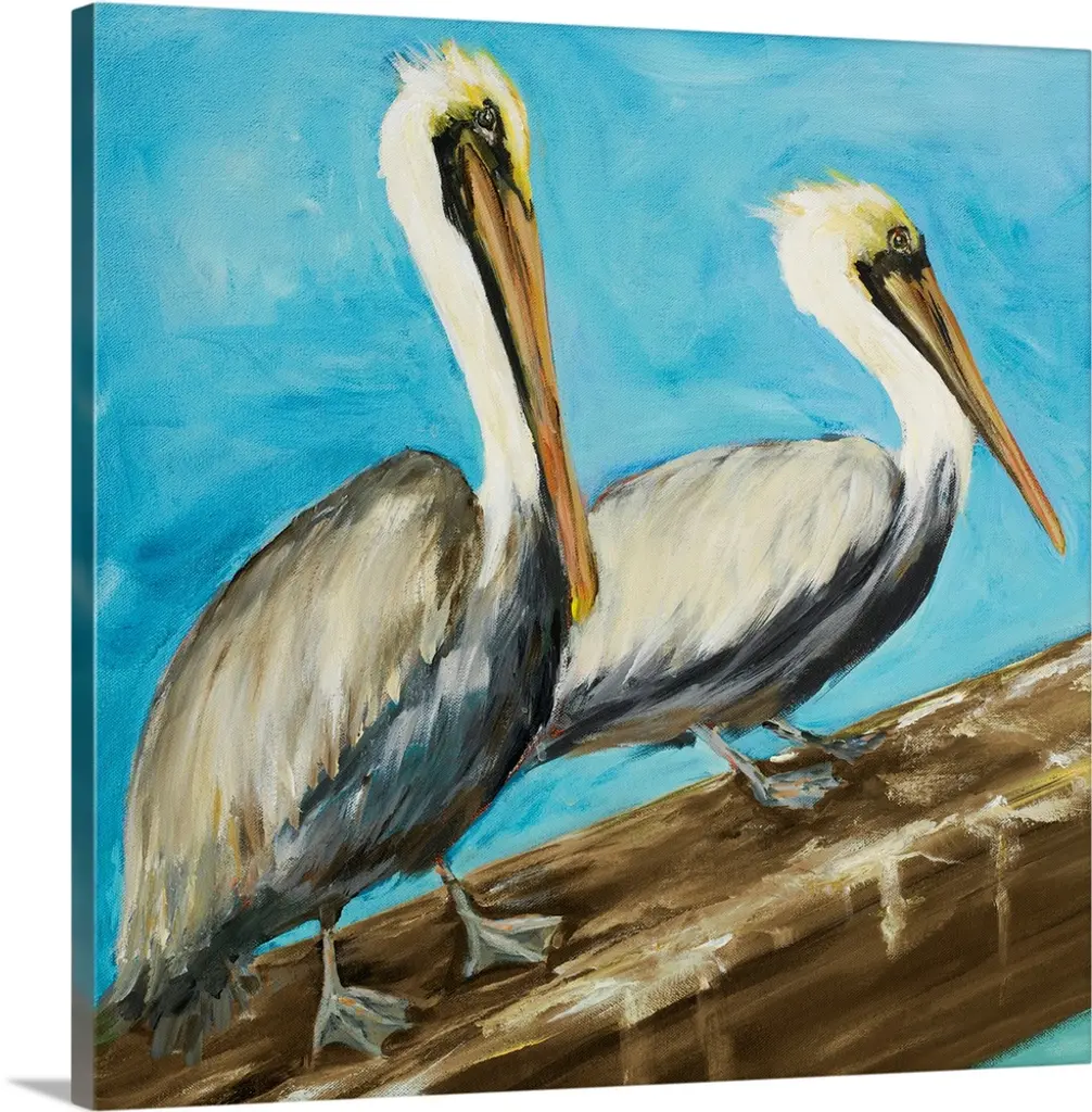 A contemporary painting of two pelicans resting on a wooden log with a blue background.