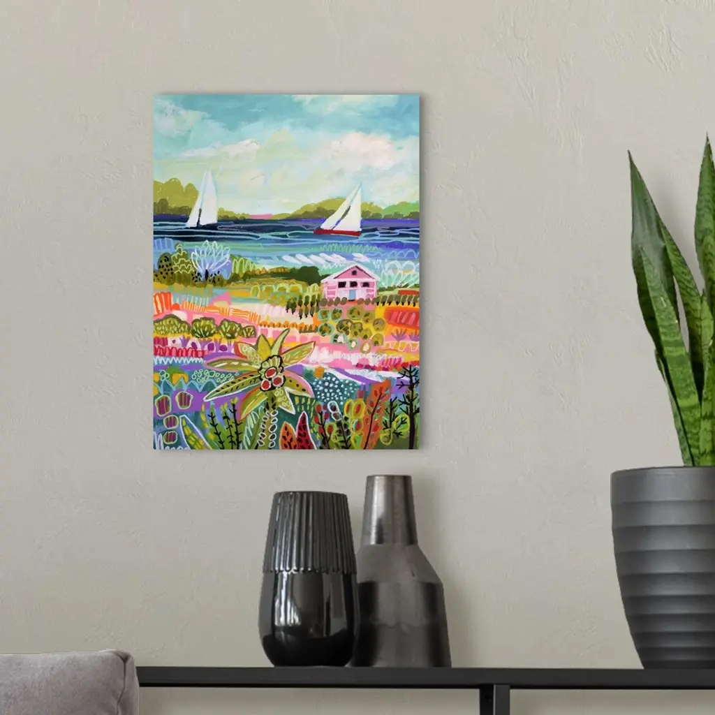 This digital artwork breaks the image down into mottled shapes of color resembling an impressionistic look of a tropical scene.