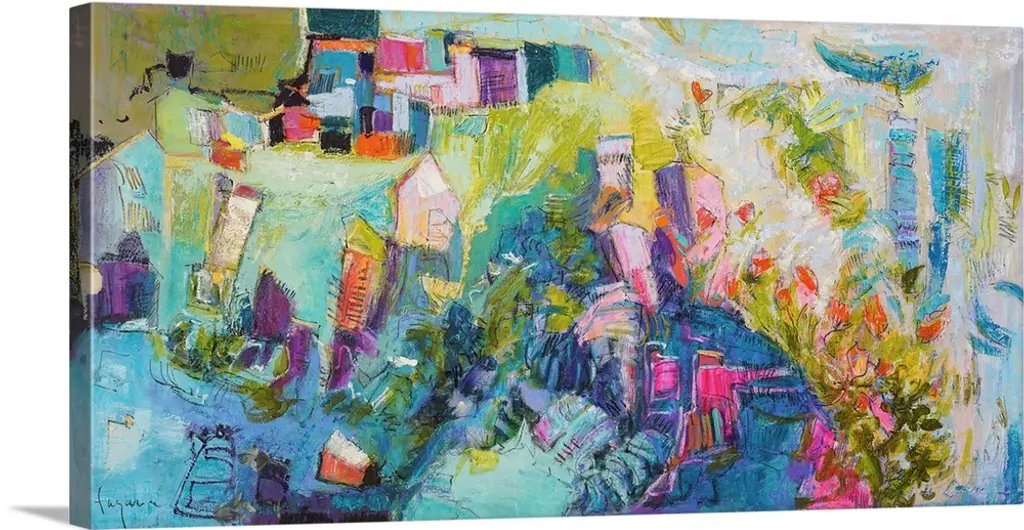 This digital artwork breaks the image down into mottled shapes of color resembling an impressionistic look of a tropical scene.