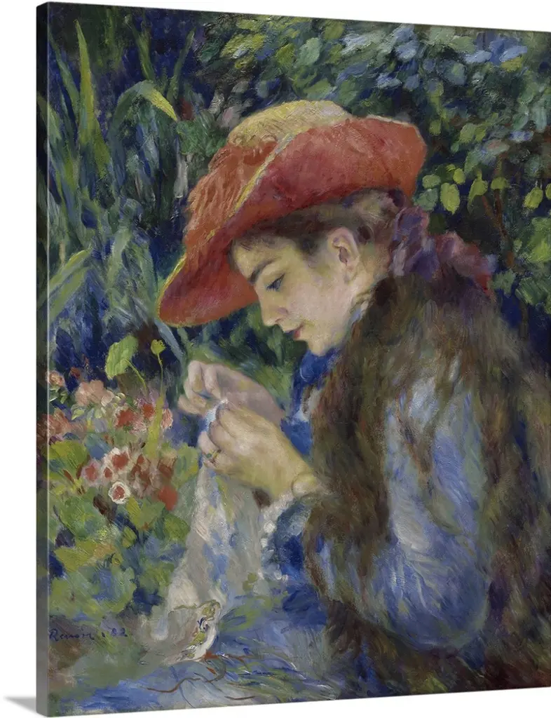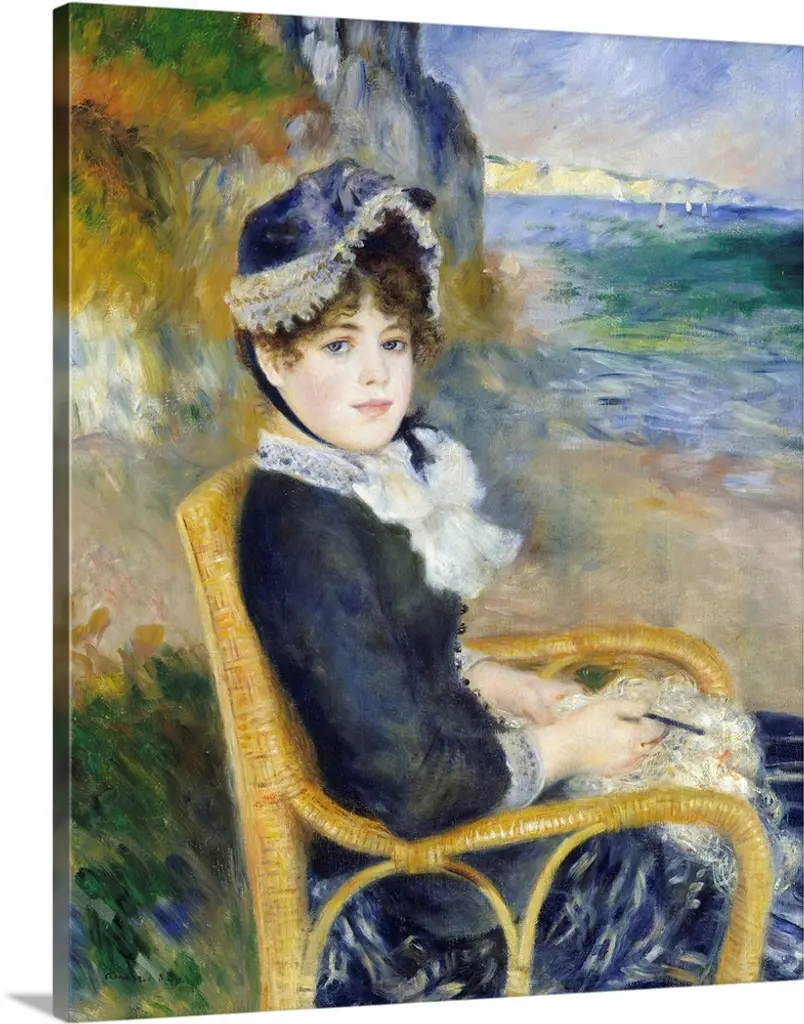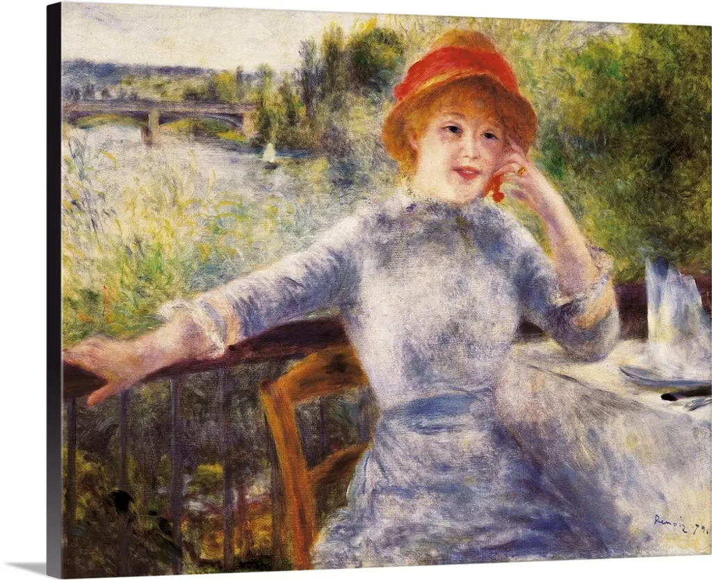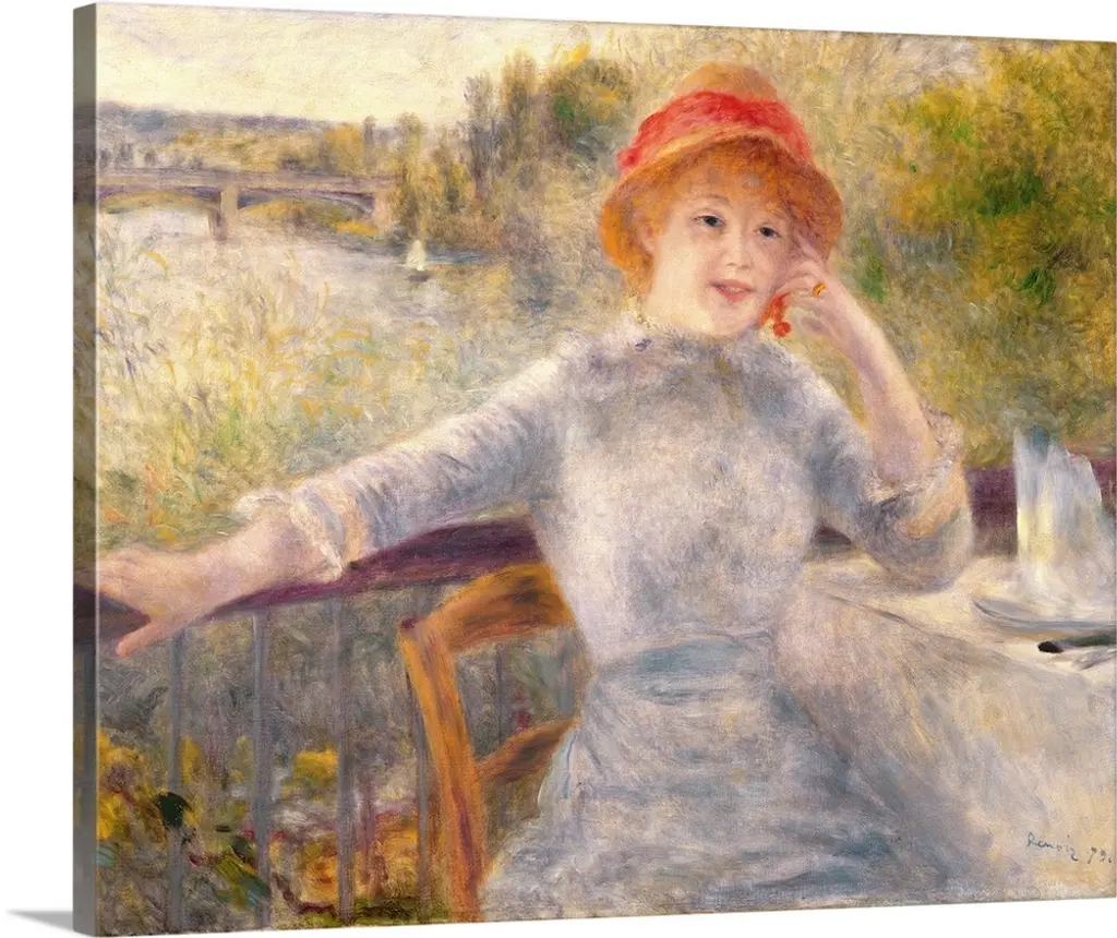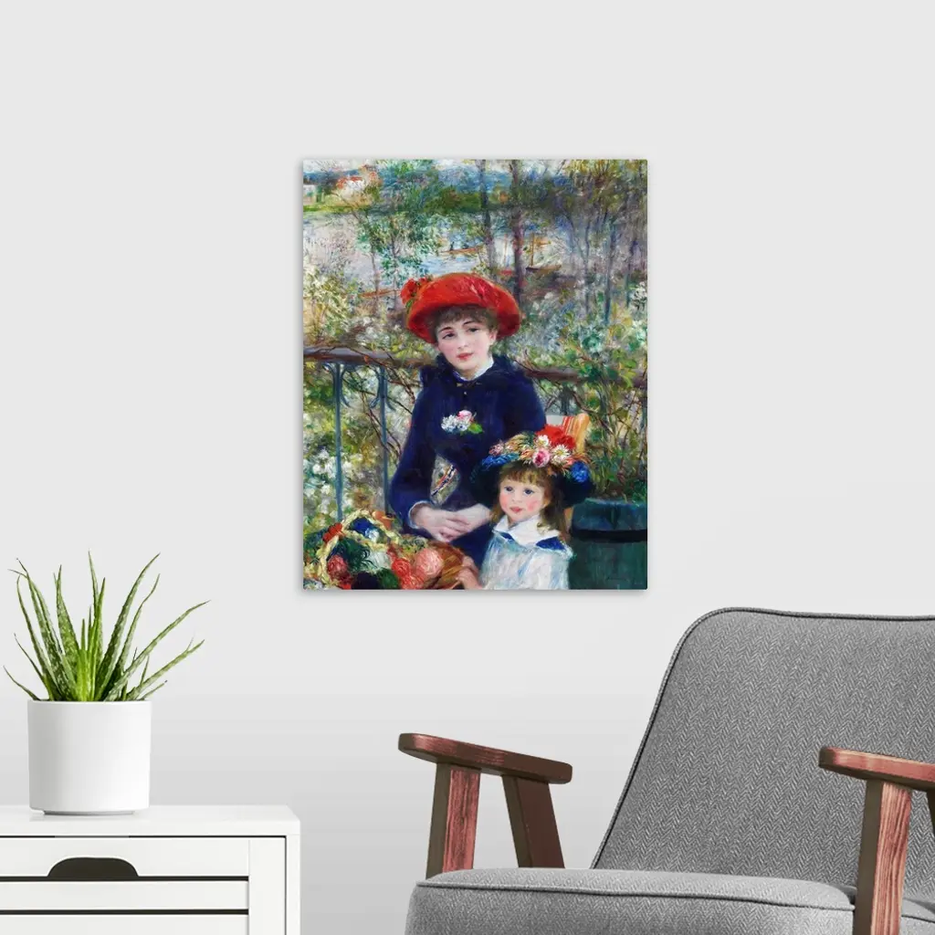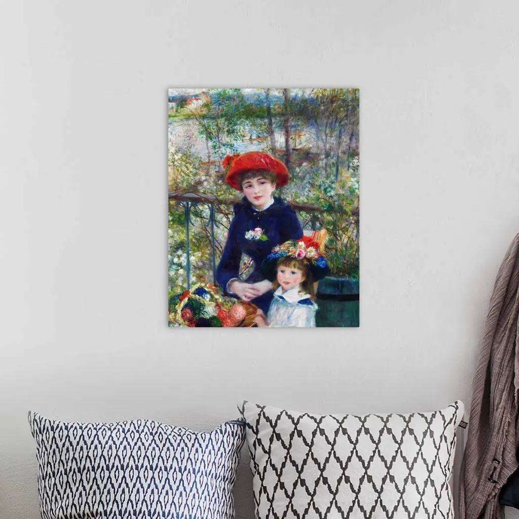 "He loves everything that is joyous, brilliant, and consoling in life," an anonymous interviewer once wrote about Pierre-Auguste Renoir. This may explain why Two Sisters (On the Terrace) is one of the most popular paintings in the Art Institute. Here Renoir depicted the radiance of lovely young women on a warm and beautiful day. The older girl, wearing the female boater's blue flannel, is posed in the center of the evocative landscape backdrop of Chatou, a suburban town where the artist spent much of the spring of 1881. She gazes absently beyond her younger companion, who seems, in a charming visual conceit, to have just dashed into the picture. Technically, the painting is a tour de force: Renoir juxtaposed solid, almost life-size figures against a landscape that - like a stage set - seems a realm of pure vision and fantasy. The sewing basket in the left foreground evokes a palette, holding the bright, pure pigments that the artist mixed, diluted, and altered to create the rest of the painting. Although the girls were not actually sisters, Renoir's dealer showed the work with this title, along with, Acrobats at the Cirque Fernando and others, at the seventh Impressionist exhibition, in 1882.