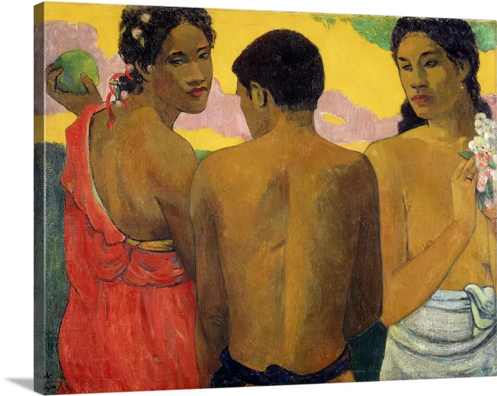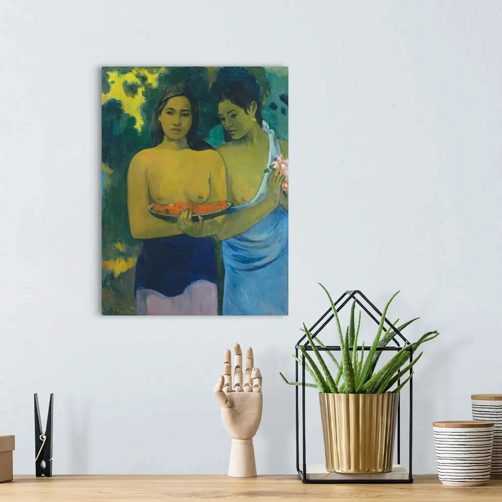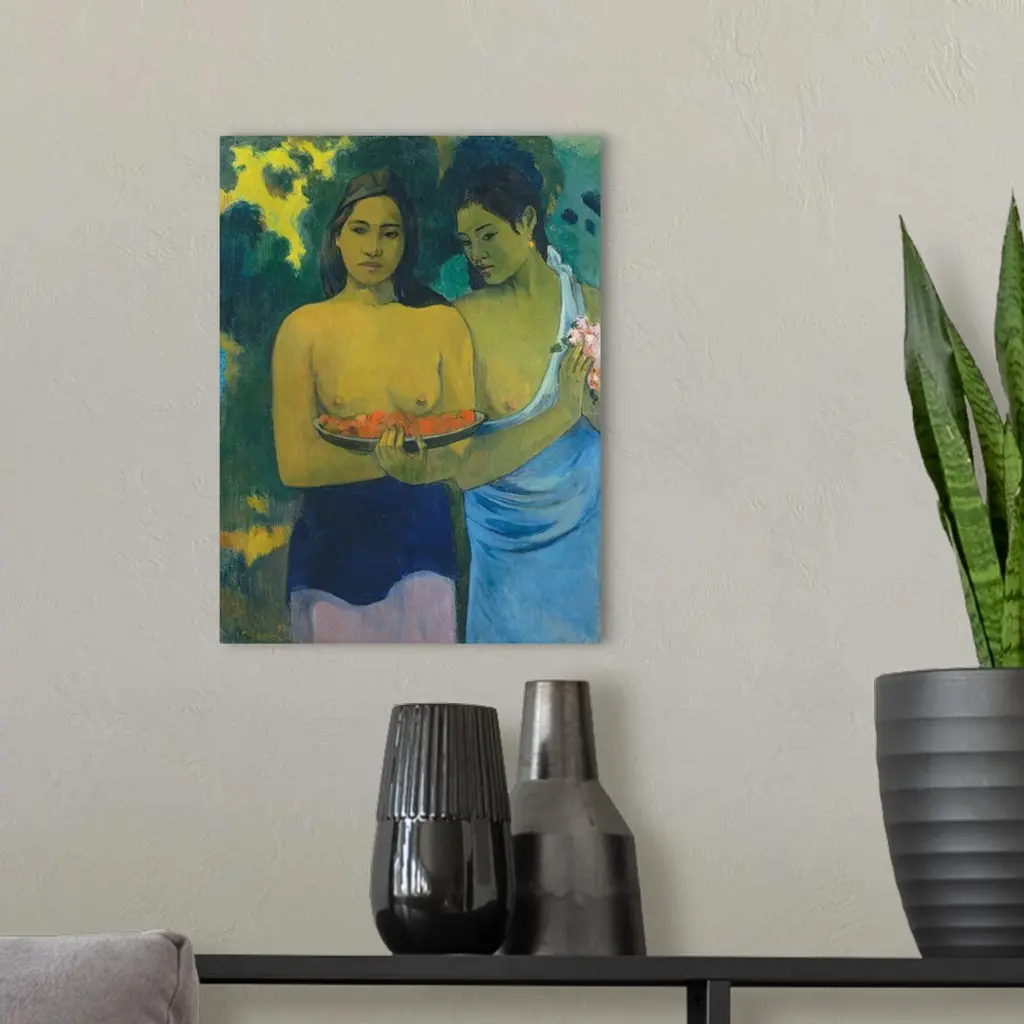 As Gauguin brought his work in Tahiti to a close, he focused increasingly on the beauty and serene virtues of the native women. In this painting, he depended on sculpturally modeled forms, gesture, and facial expression to vivify the sentiments he had used to describe the Tahitian Eve: very subtle, very knowing in her naivete and at the same time still capable of walking around naked without shame. These two figures first appear in the artist's monumental frieze Faa Iheihe (Tahitian Pastoral)of 1898 (Tate, London) and again in the even larger Rupe Rupe (The Fruit Harvest)of 1899 (Pushkin Museum of Fine Arts, Moscow), which he composed for the upcoming Exposition Universelle of 1900.