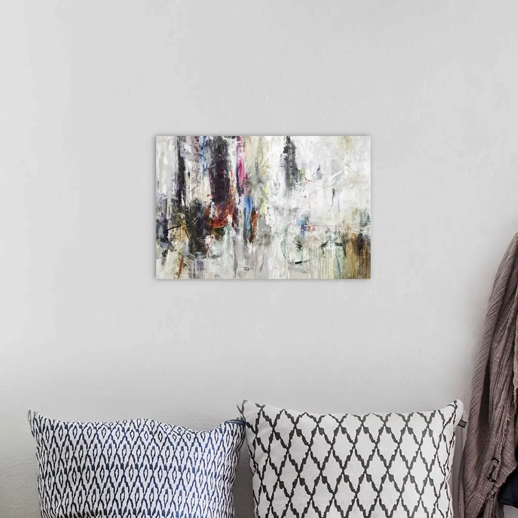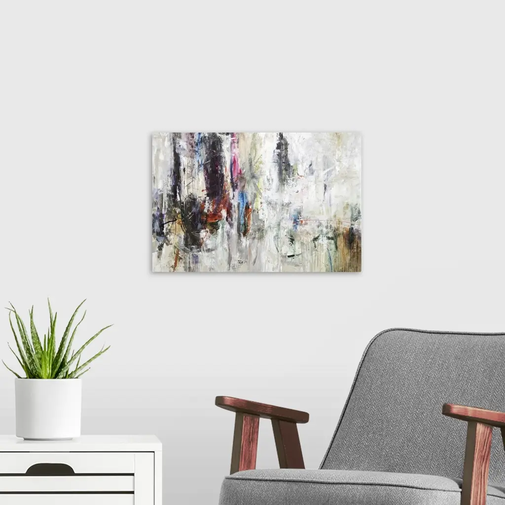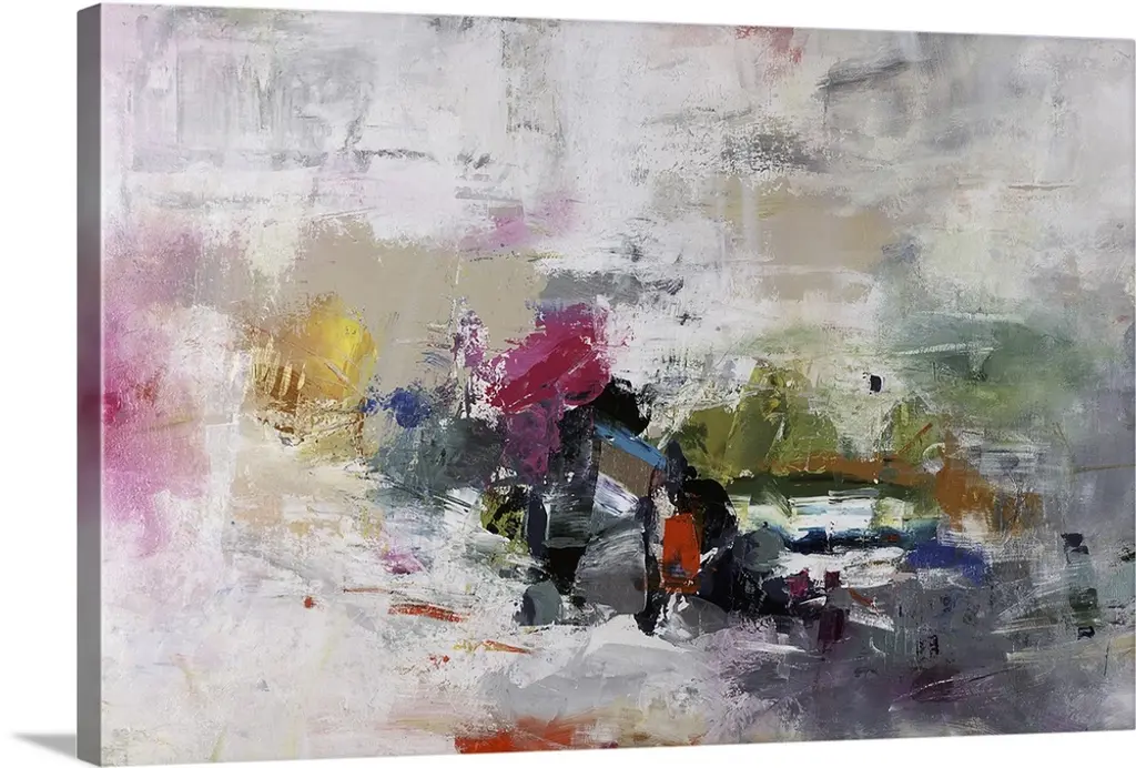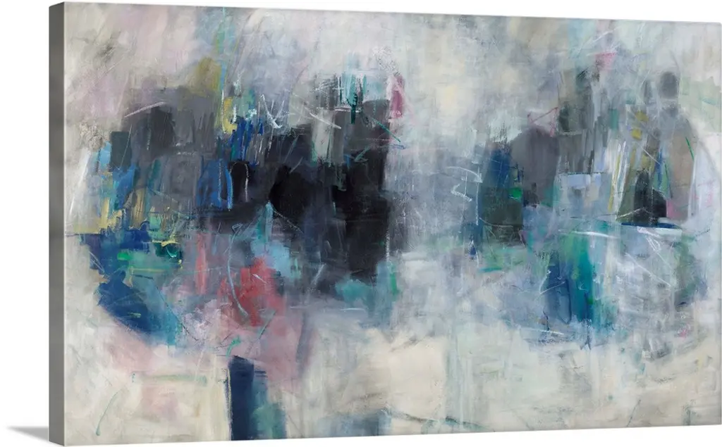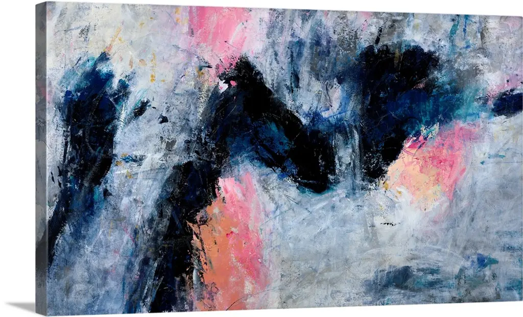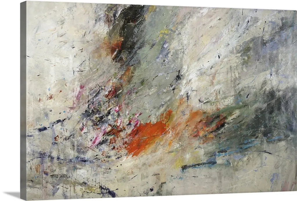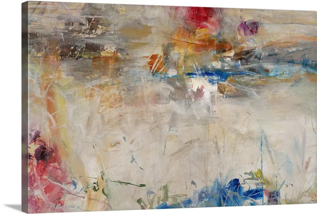 Large horizontal abstract painting of textured brush strokes with red and blue accents.