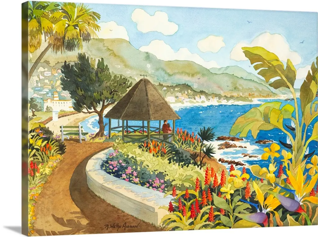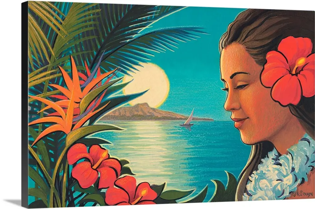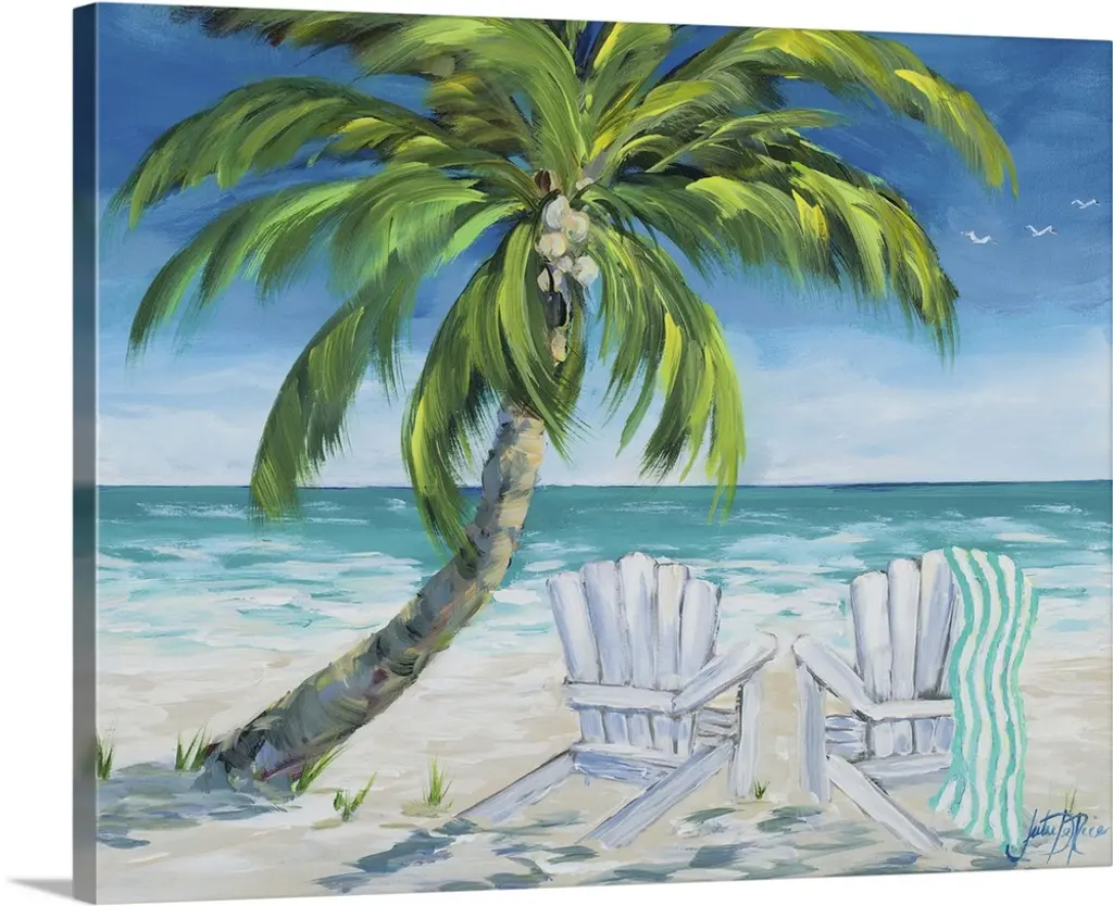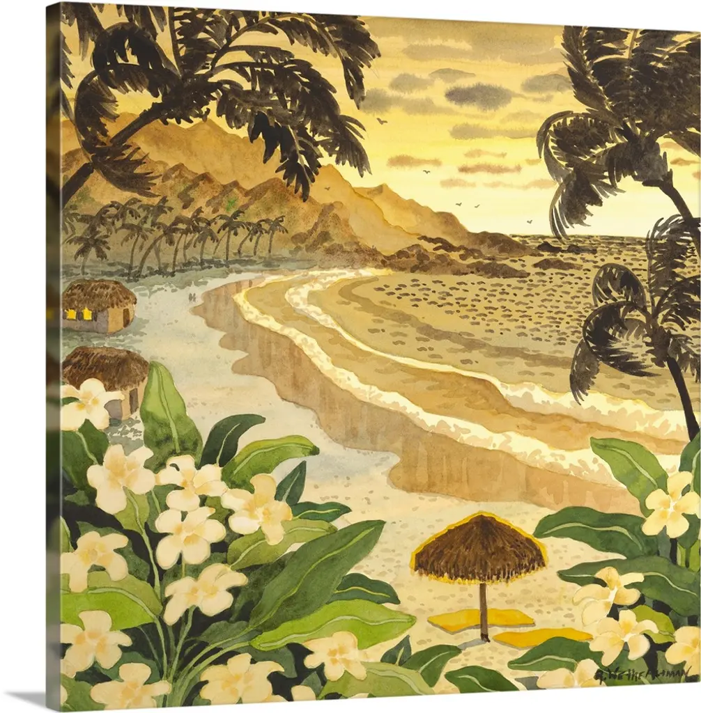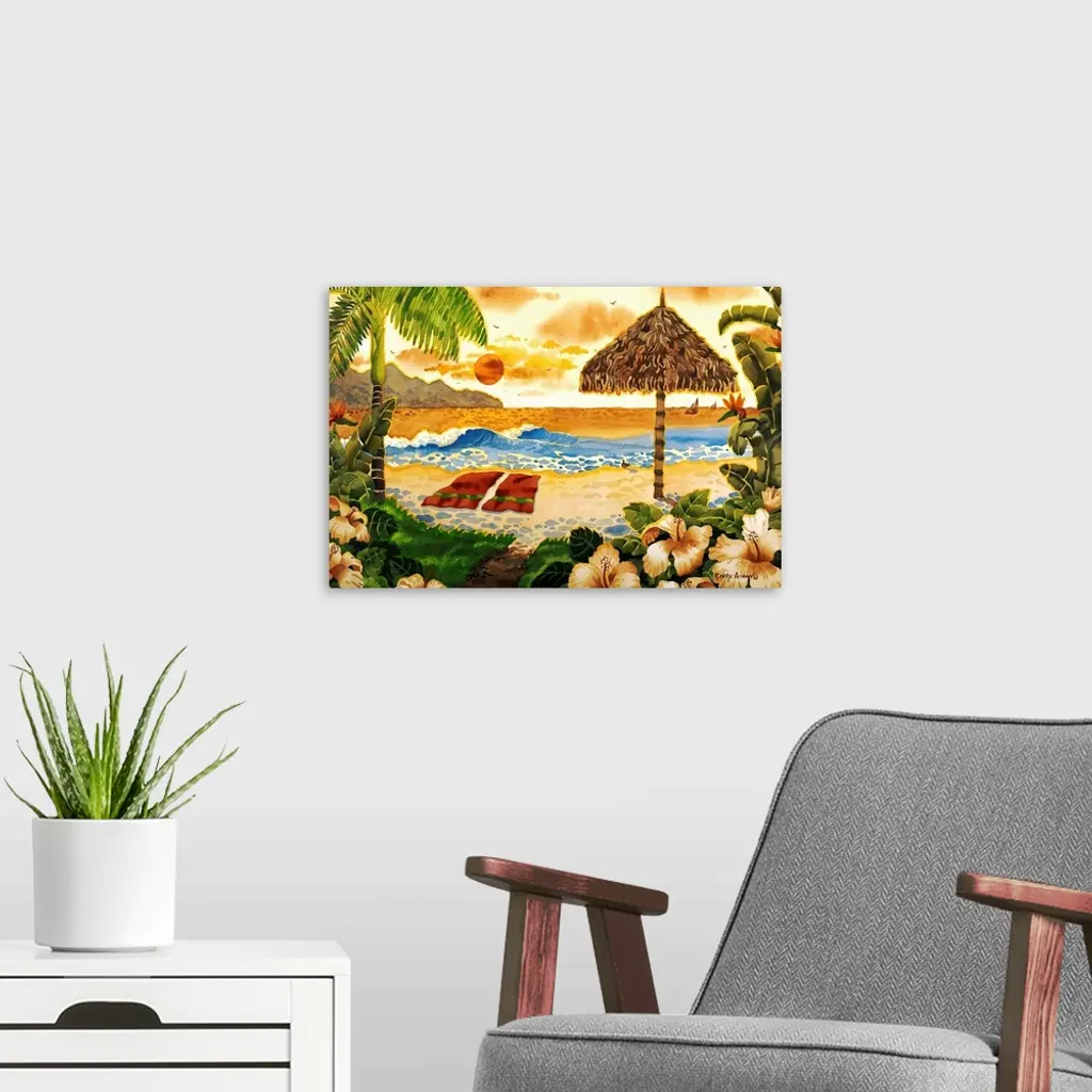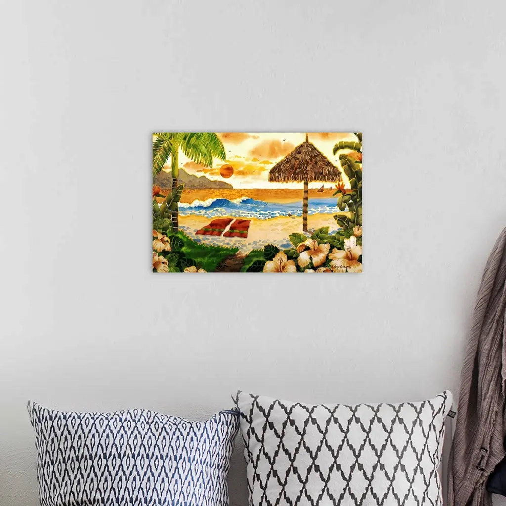 Watercolor painting of a tropical beach scene, with hibiscus flowers, a raffia parasol, and ocean waves.