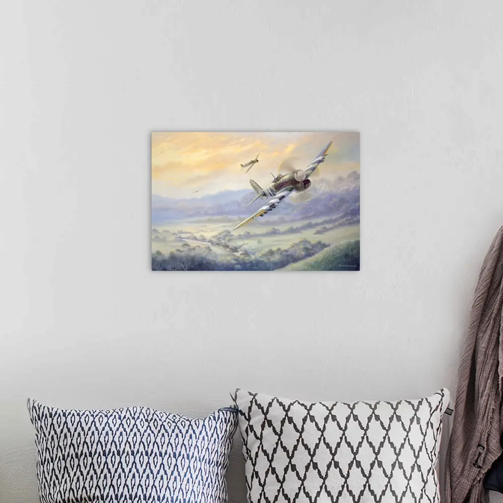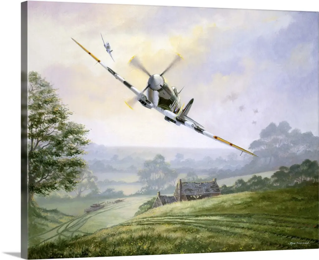 Contemporary artwork of military fighter planes flying over a rural landscape with tank caravan moving slowly on the road below.