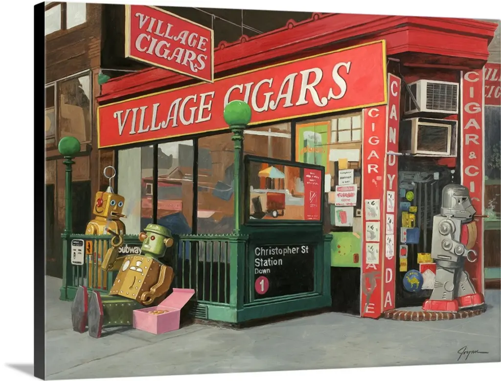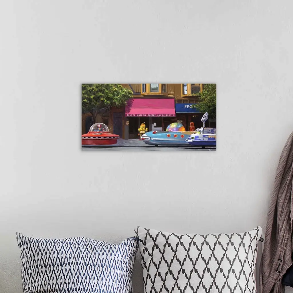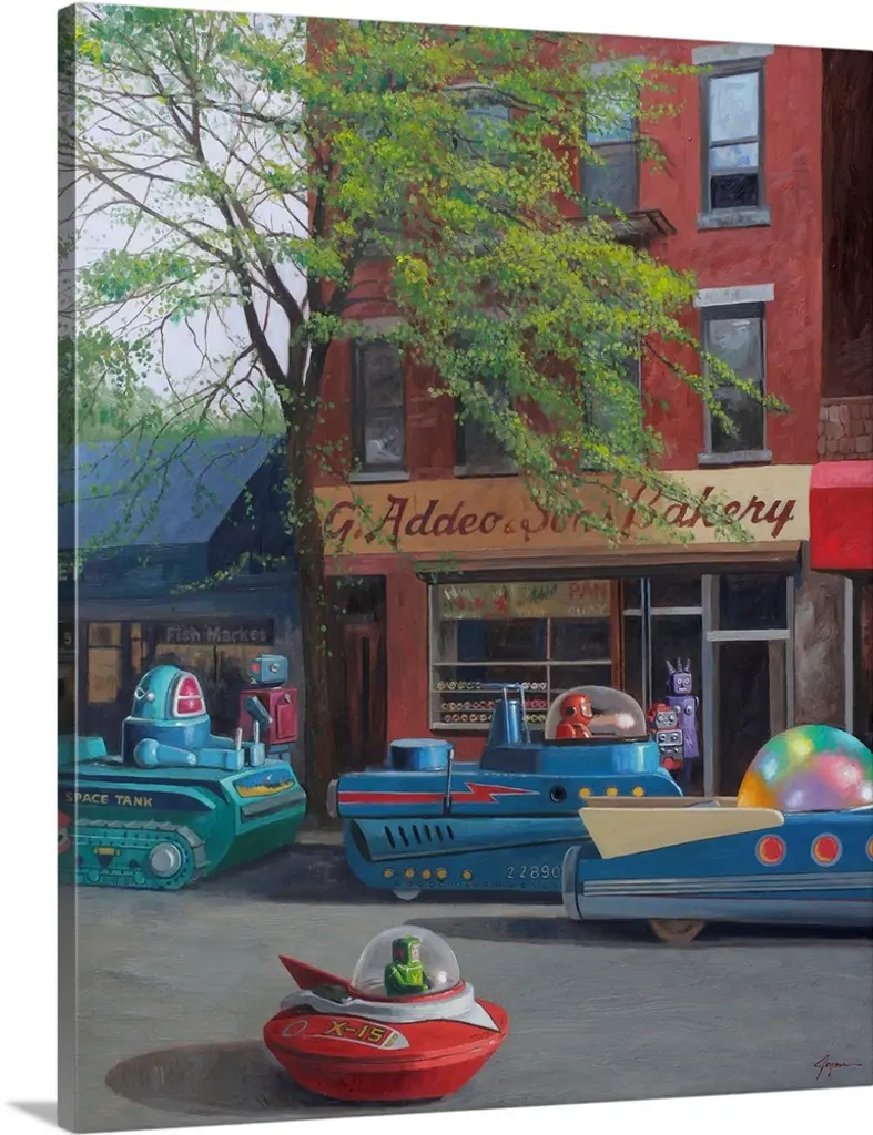 A contemporary painting of a city street scene with retro toy robots driving rocket ship cars.