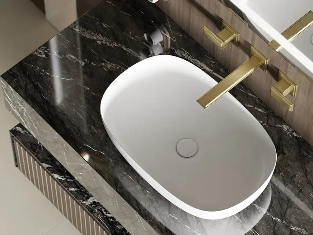 Elevate your bathroom with this handmade oval sink crafted from concrete in a sleek Rain Gray finish. Designed without an overflow hole, it exudes modern simplicity, ideal for a deck-mounted faucet. A functional art piece to upgrade your space.