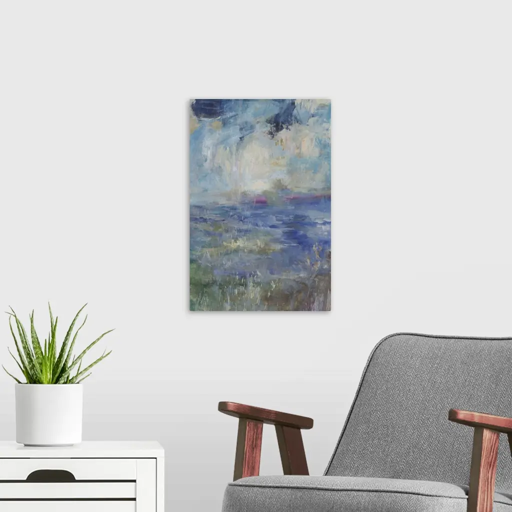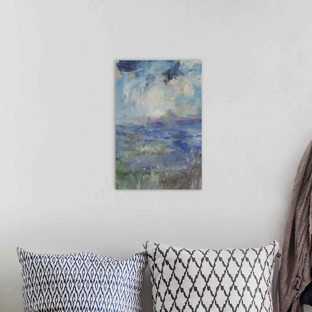 Abstract contemporary artwork in shades of blue, resembling a seascape.