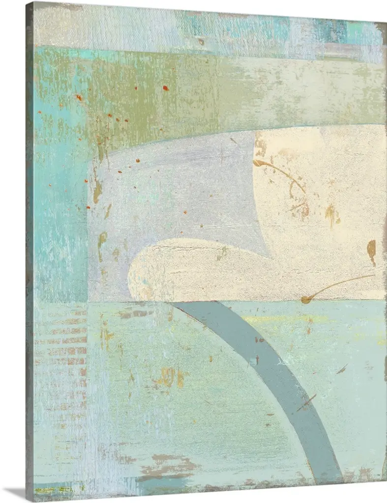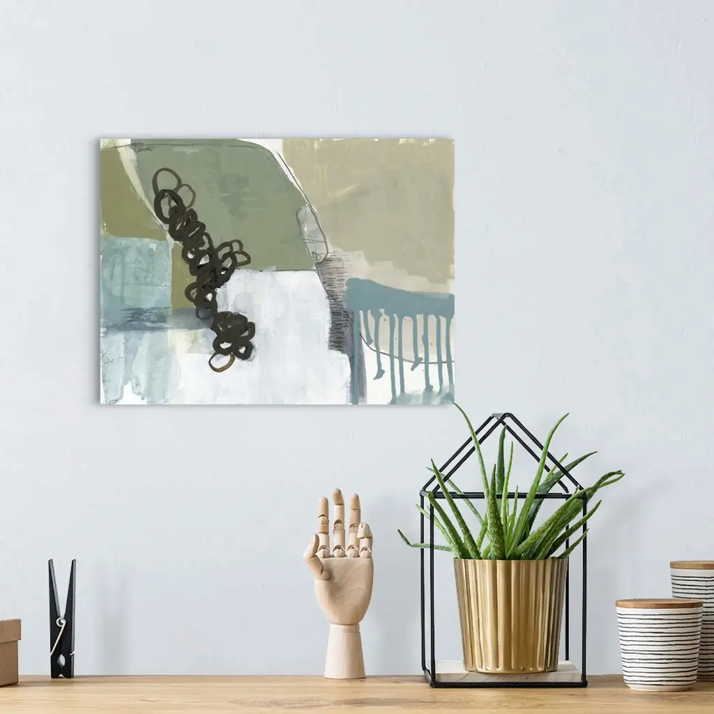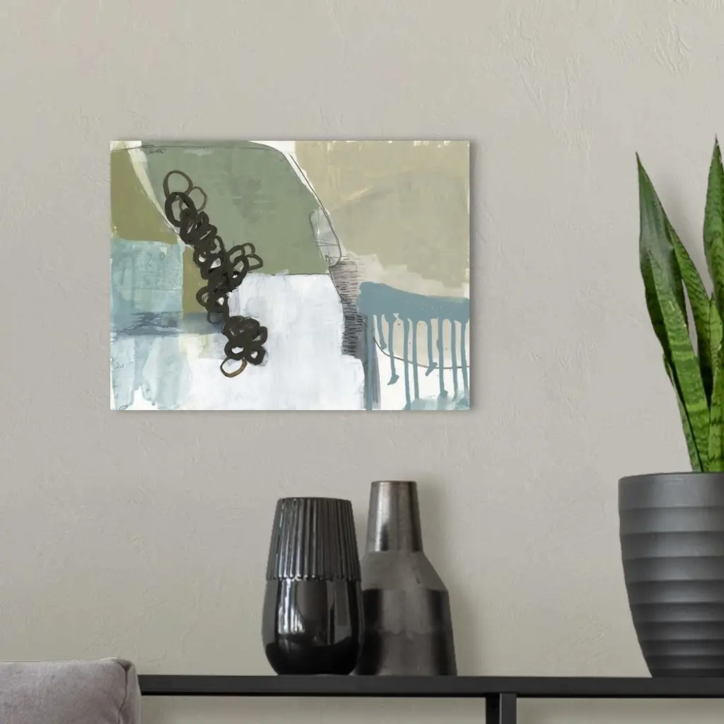 Contemporary abstract painting with paint drips, circular shapes and blocks of color in olive green, blue, and dusty pink.