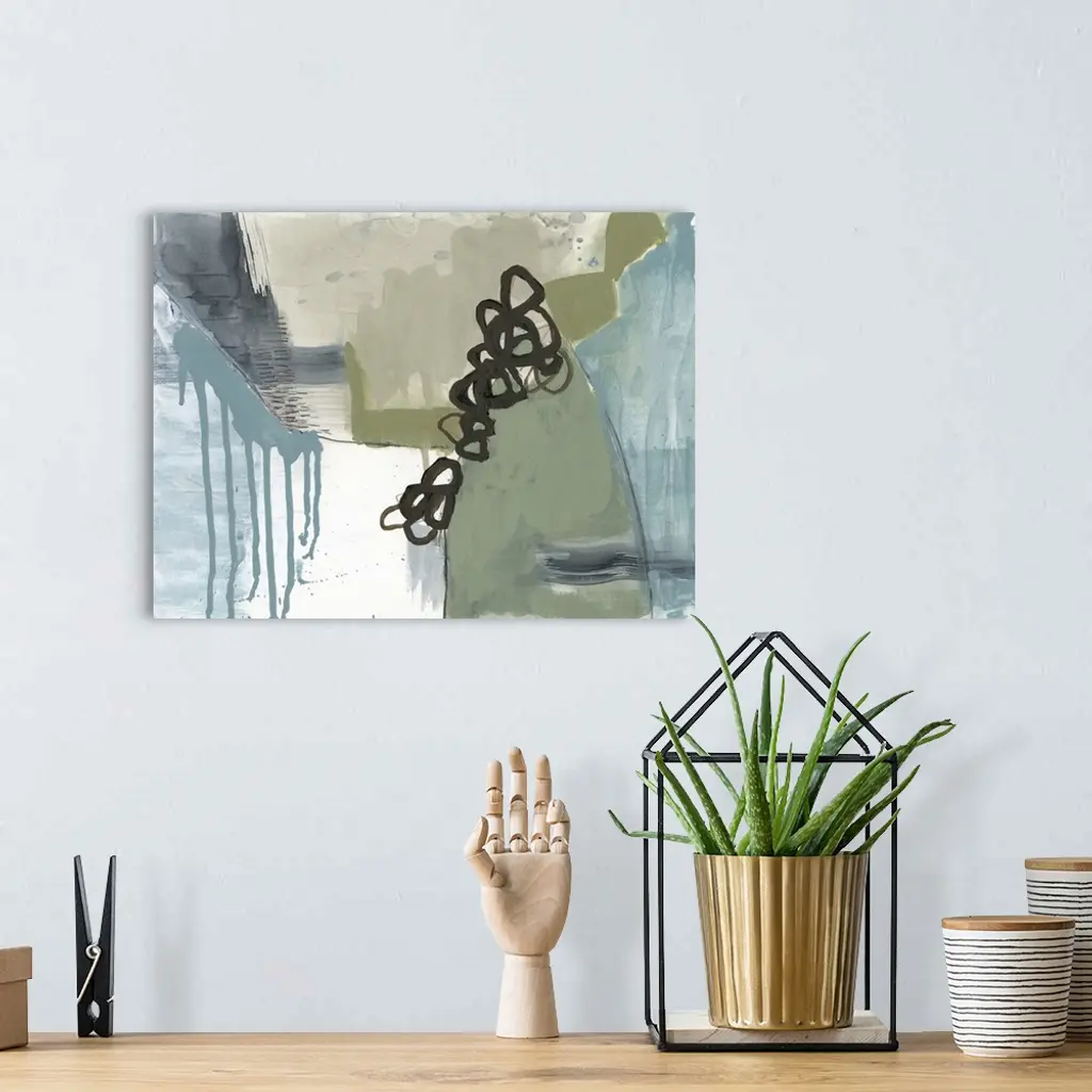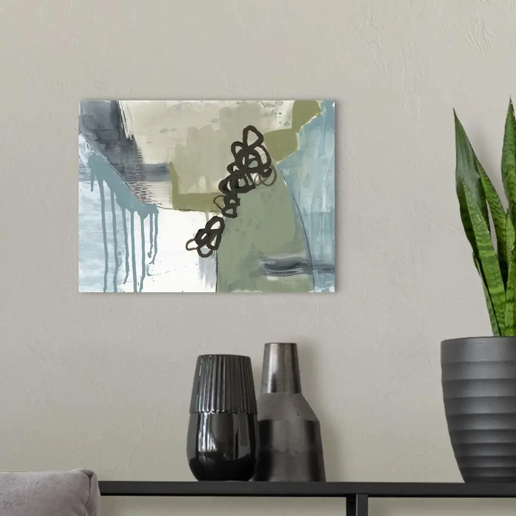Contemporary abstract painting with paint drips, circular shapes and blocks of color in olive green, blue, and dusty pink.