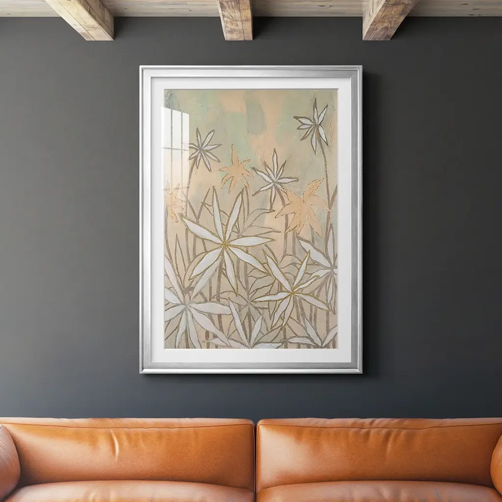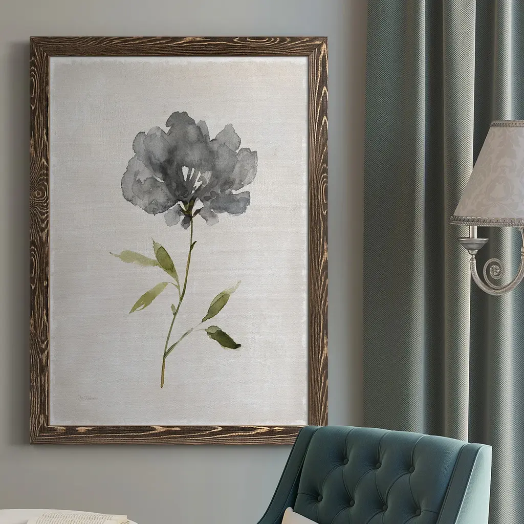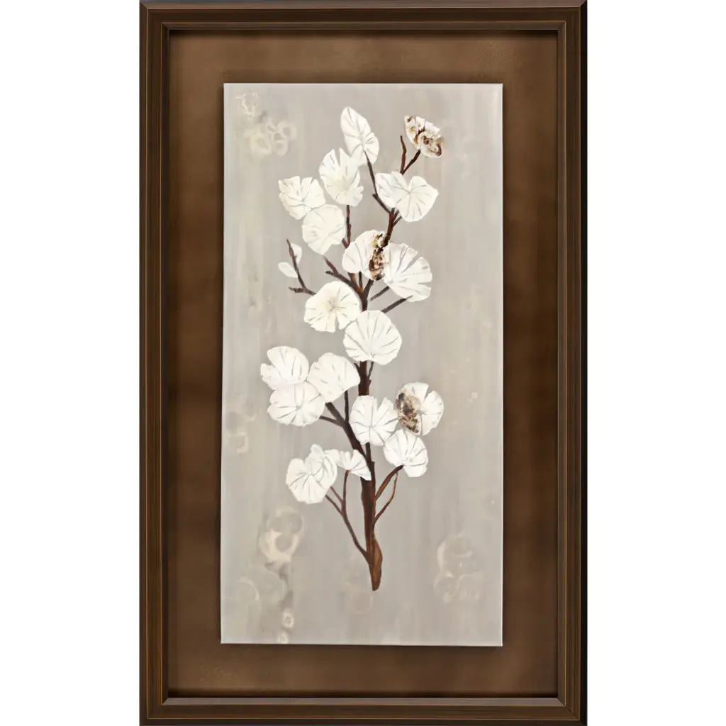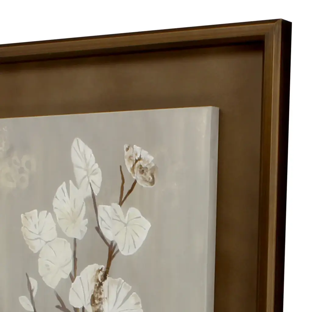 Exclusive hand painted canvas is mounted on a crackled board. Framed in a contemporary dark antique bronze wood.