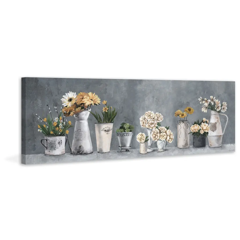 Rusted and worn watering cans and milk jugs make perfect homes for colorful peach and white flowers in this colorful and quaint print of a rustic and homey collection of flowers to decorate your home with. Proudly made in the USA, this piece is printed on canvas before it's stretched over non-warping wooden bars for a gallery-wrapped look. With wall-mounting hooks included, this artful accent is ready to hang up as soon as it reaches your front door. • Fine art canvas print from the Marmont Hill Art Collective • Professionally hand stretched • Gallery wrapped in sustainable, non-warping wood • Arrives ready to hang • Made in the USA • Includes a certificate of authenticity