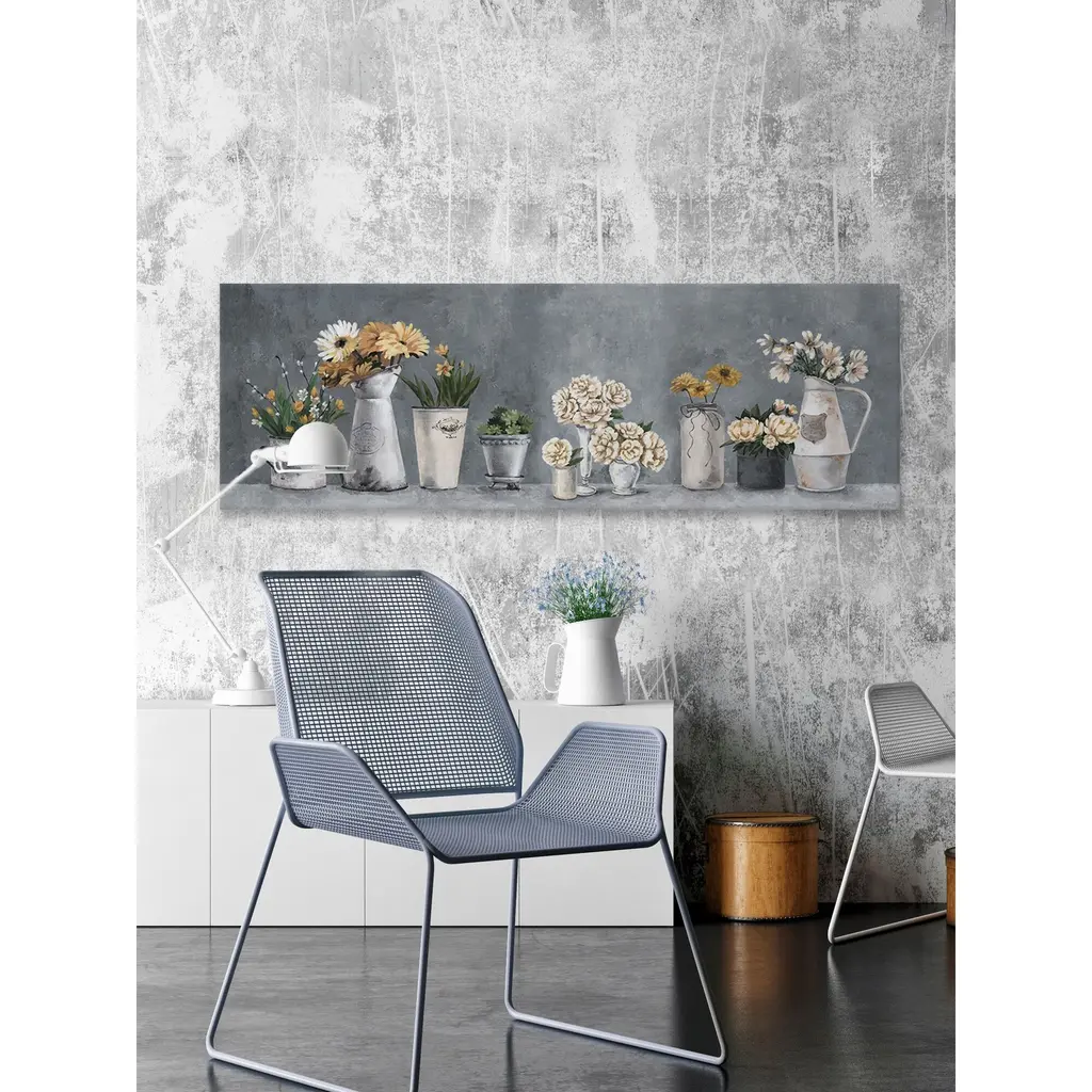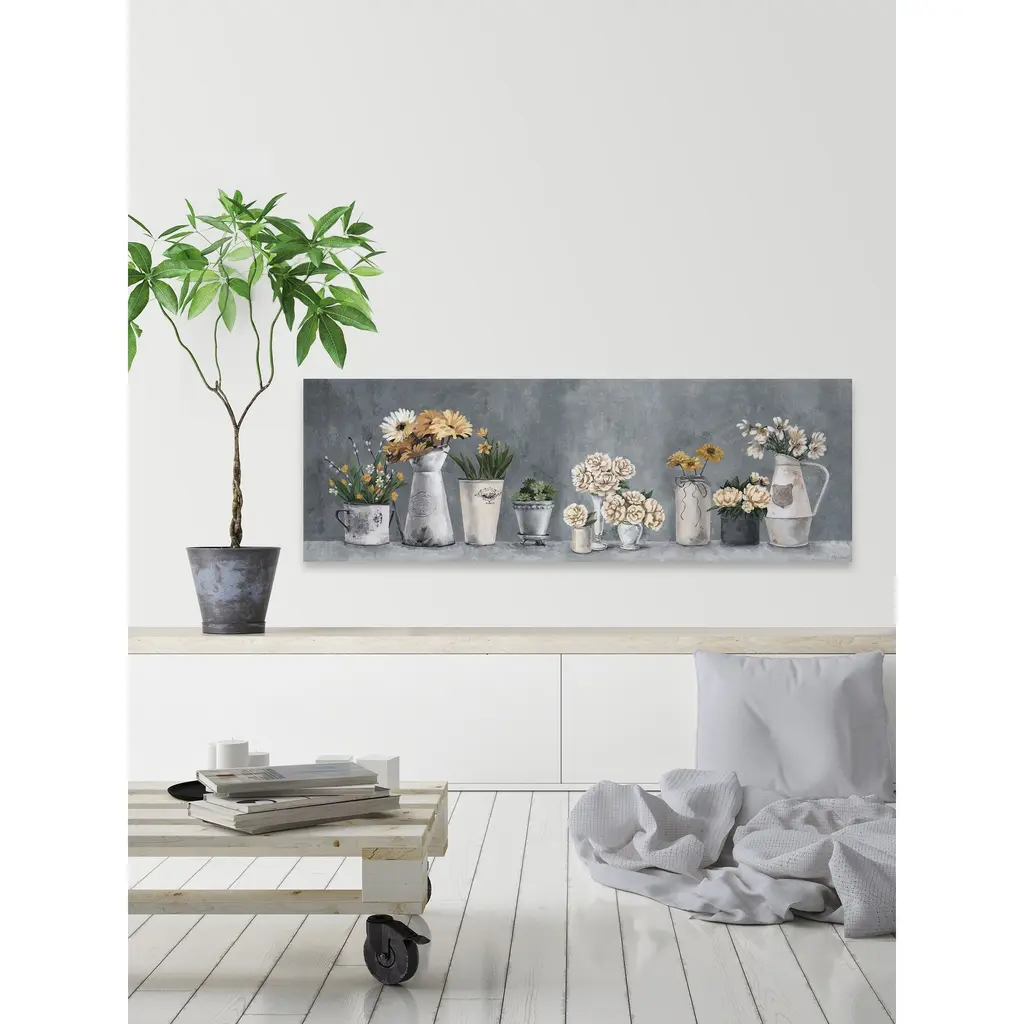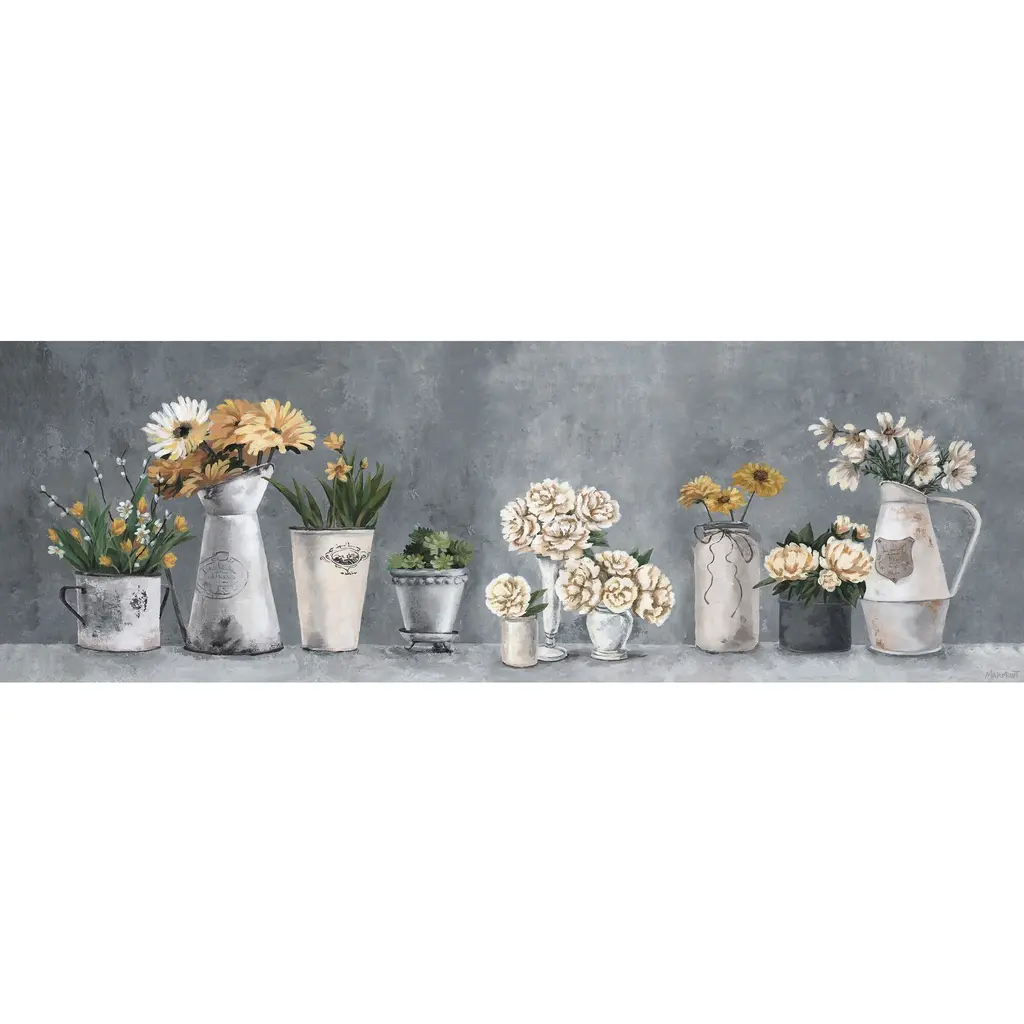 Rusted and worn watering cans and milk jugs make perfect homes for colorful peach and white flowers in this colorful and quaint print of a rustic and homey collection of flowers to decorate your home with. Proudly made in the USA, this piece is printed on canvas before it's stretched over non-warping wooden bars for a gallery-wrapped look. With wall-mounting hooks included, this artful accent is ready to hang up as soon as it reaches your front door. • Fine art canvas print from the Marmont Hill Art Collective • Professionally hand stretched • Gallery wrapped in sustainable, non-warping wood • Arrives ready to hang • Made in the USA • Includes a certificate of authenticity