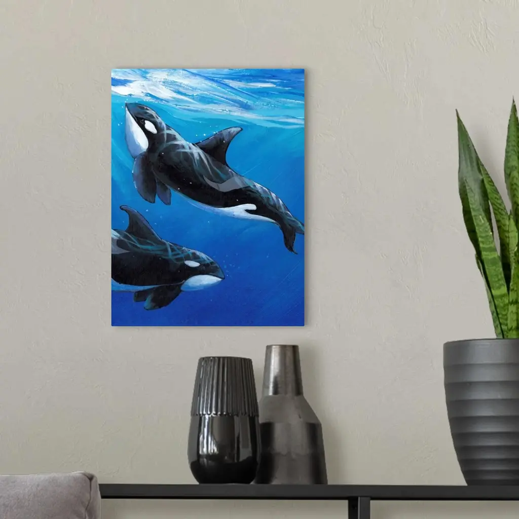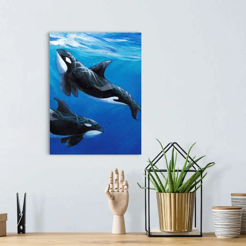 Contemporary painting of two orca whales swimming close to the surface of the ocean.