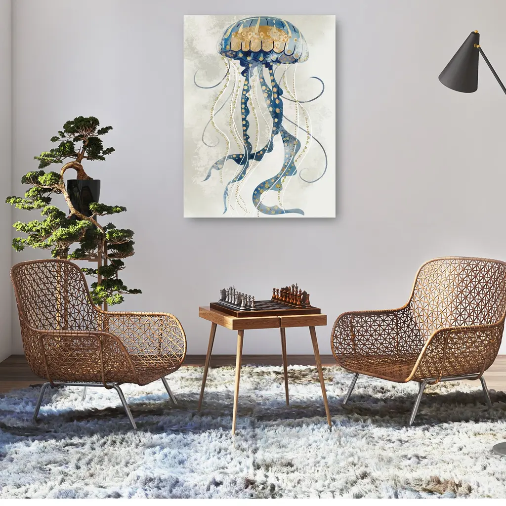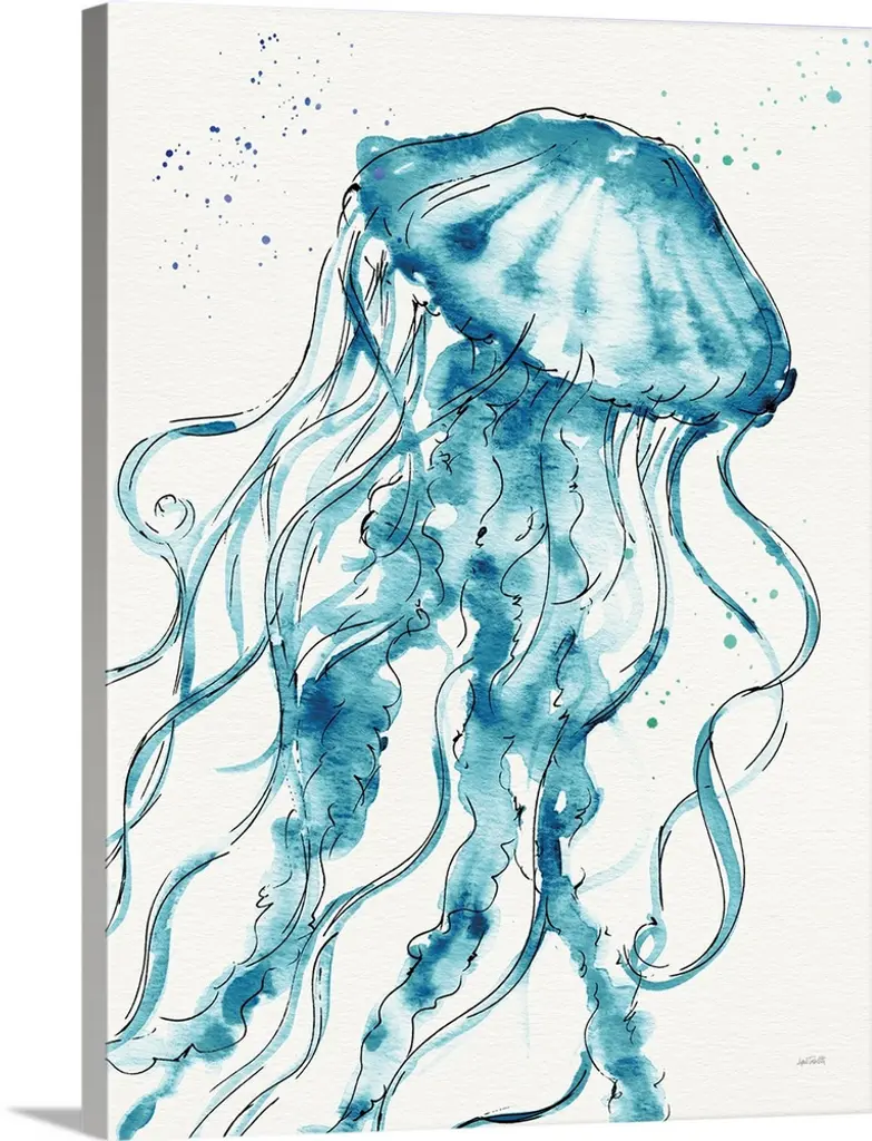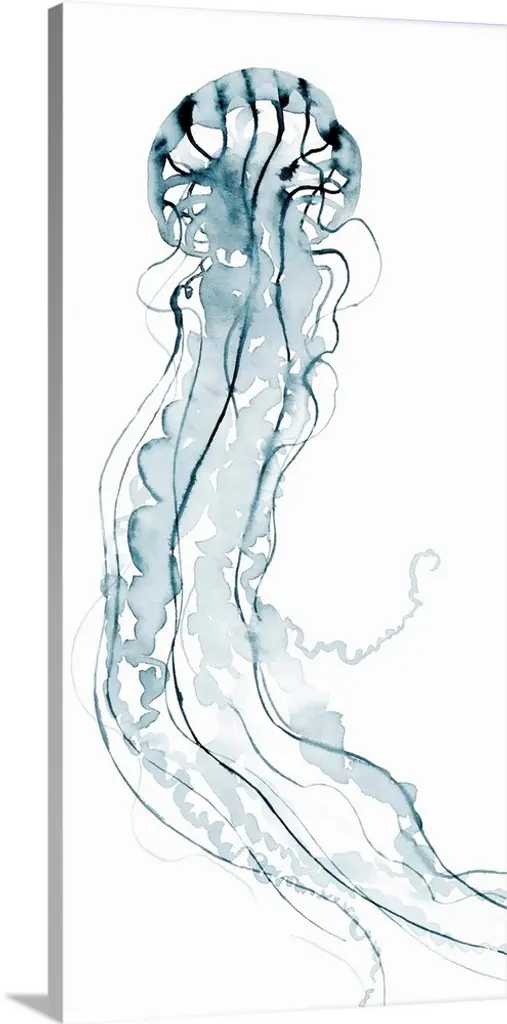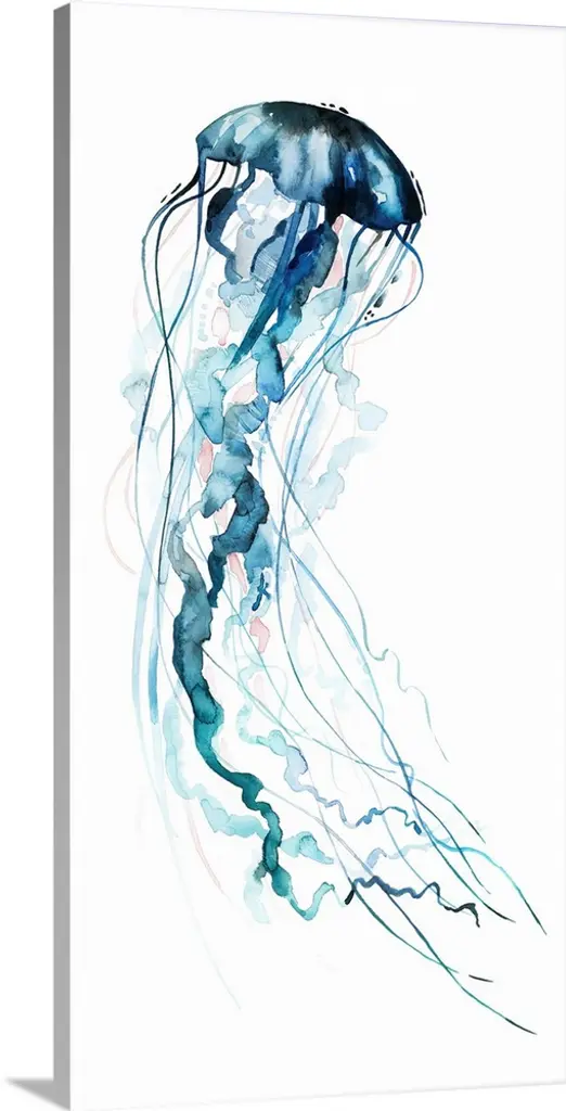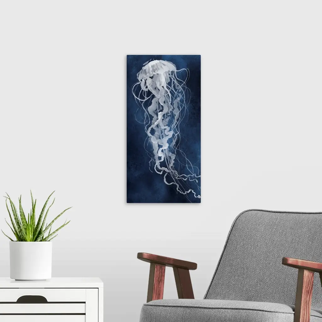 Large panel watercolor painting of a white jellyfish on an indigo background.