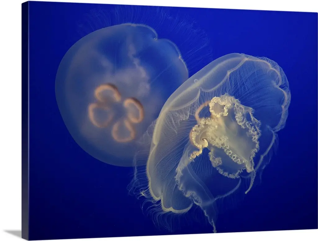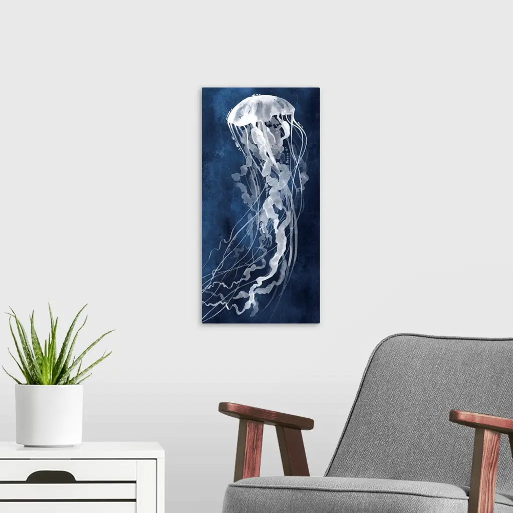 Large panel watercolor painting of a white jellyfish on an indigo background.