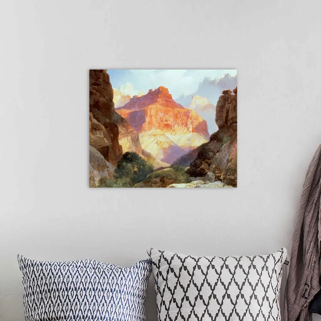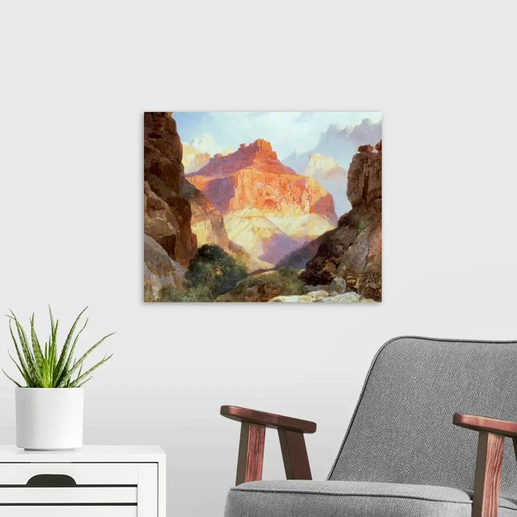 Big, horizontal painting of the Red Wall in the sunlight, surrounded by the large rocky formations of the Grand Canyon in Arizona.