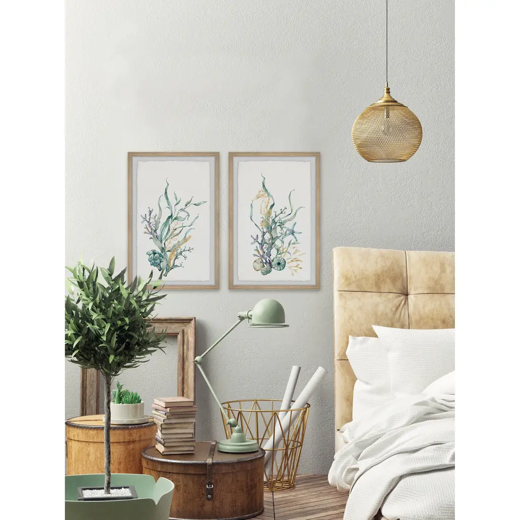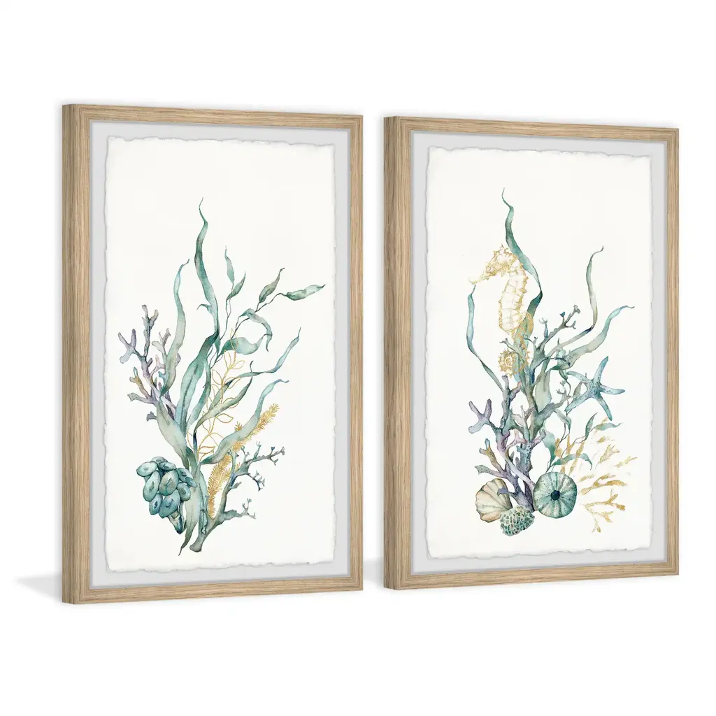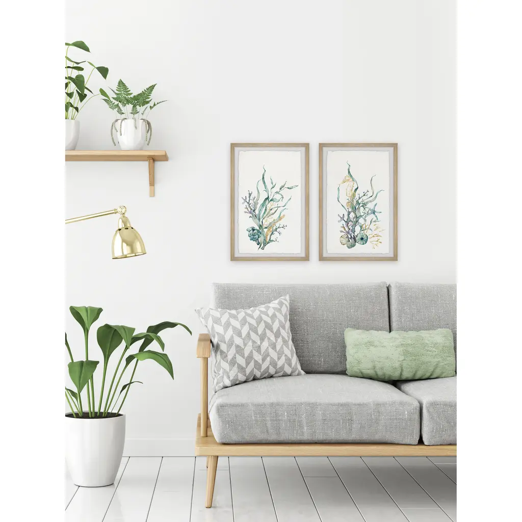 Bring oceanic patterns and a more nautical theme to your space with these two watercolor painting prints that feature coral and shells. Proudly printed in the USA, this piece is printed on high quality archive paper and professionally hand-framed. With wall-mounting hooks included, this artful accent is ready to hang up as soon as it reaches your front door. • Top quality Giclee print on high resolution Archive Paper • Hand cut deckled edges • High quality durable non-warping frame • Finished under shatter resistant plexiglass • Arrives ready to hang • Includes a certificate of authenticity • Printed in the USA