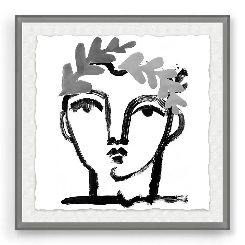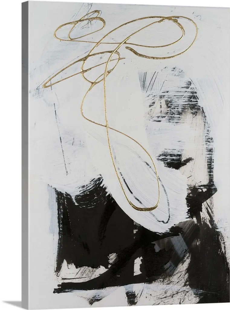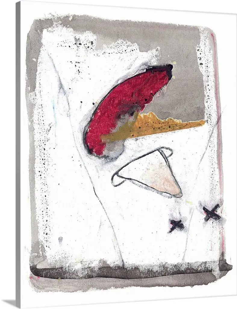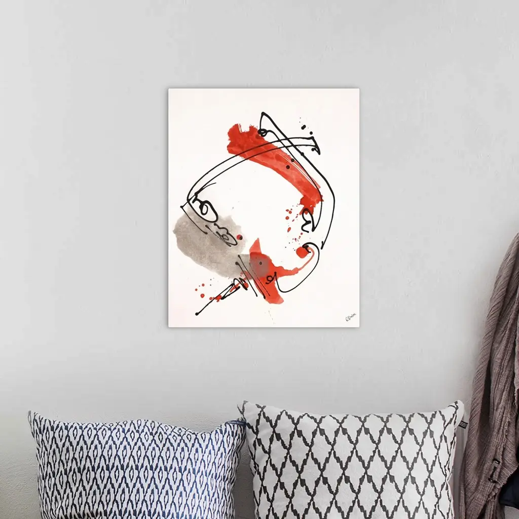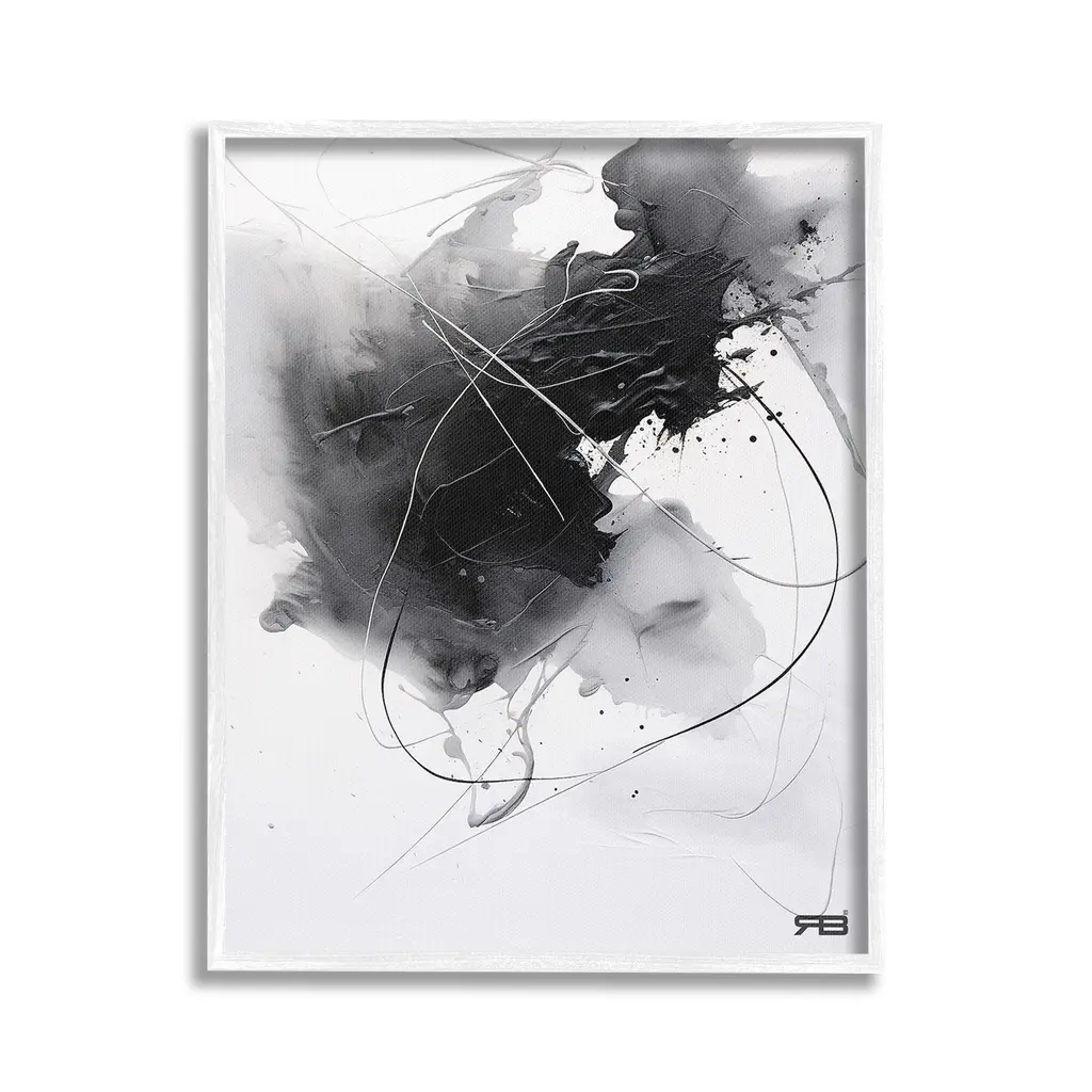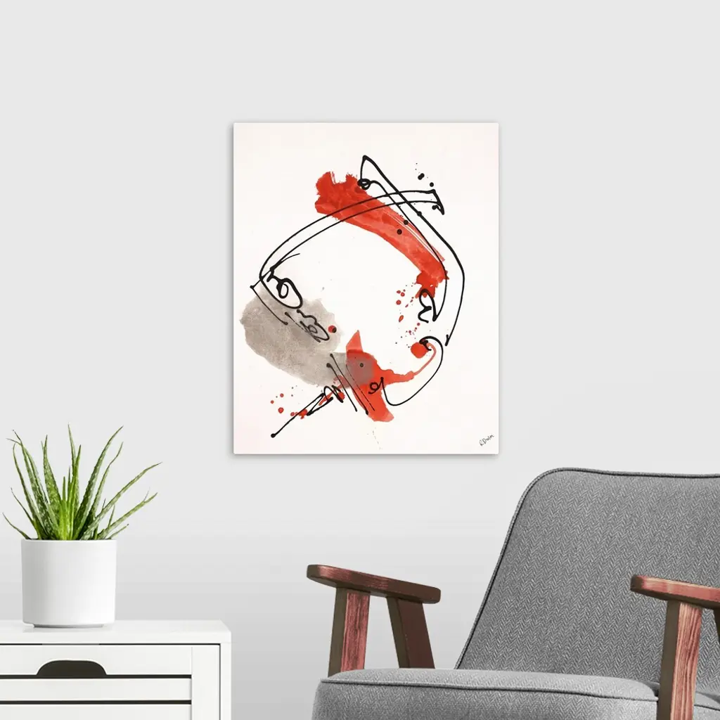 Contemporary abstract painting of dark black lines and splashes of red swirling around.