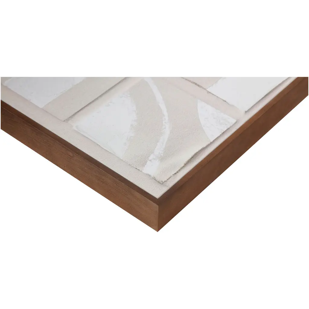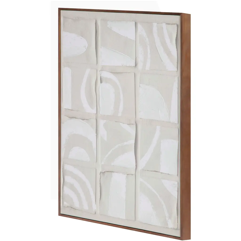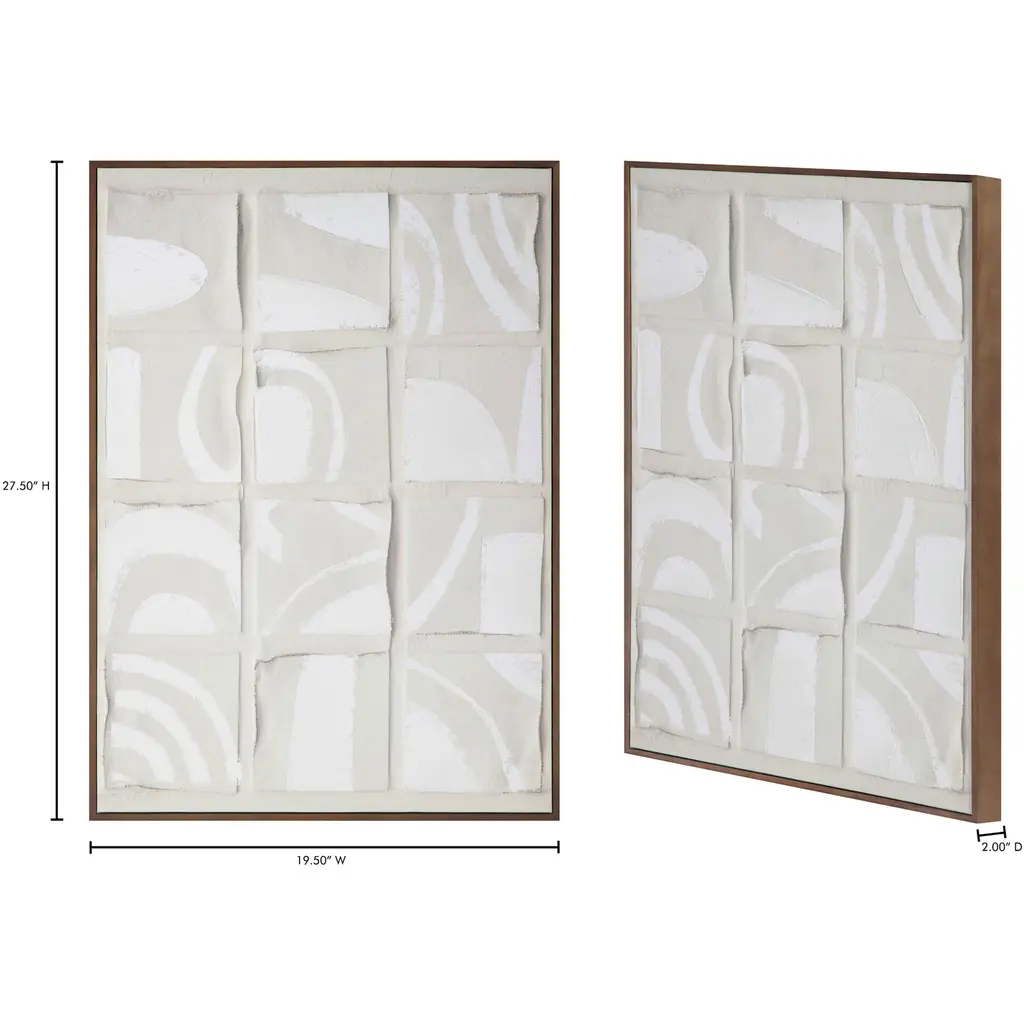 Inspired by the Dadaist movement and collage art, Unfold 1 is an homage to Ellsworth Kelly's "Cité," where ink strokes were brushed across a sheet of paper, cut into twenty squares, and randomly recomposed in a grid pattern. Shadowed tones add depth and dimension to the collage-like squares, while a neutral color palette and irregular shapes offer a softness to the sharp shapes—a remarkable abstract piece expertly finished with a solid pine frame.