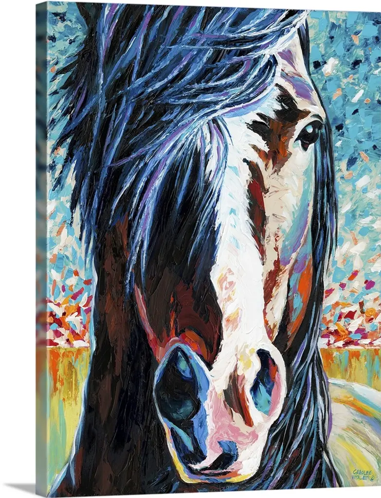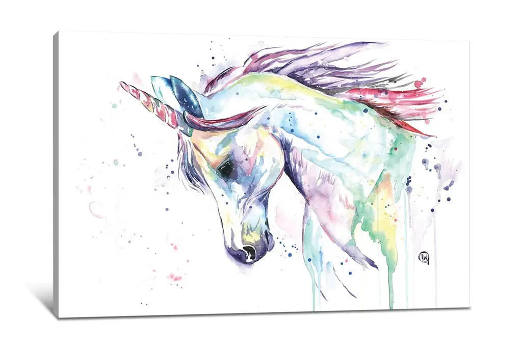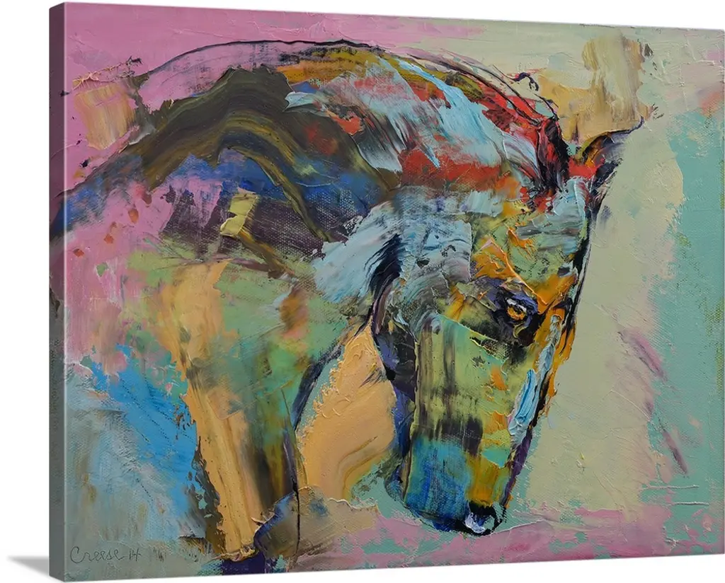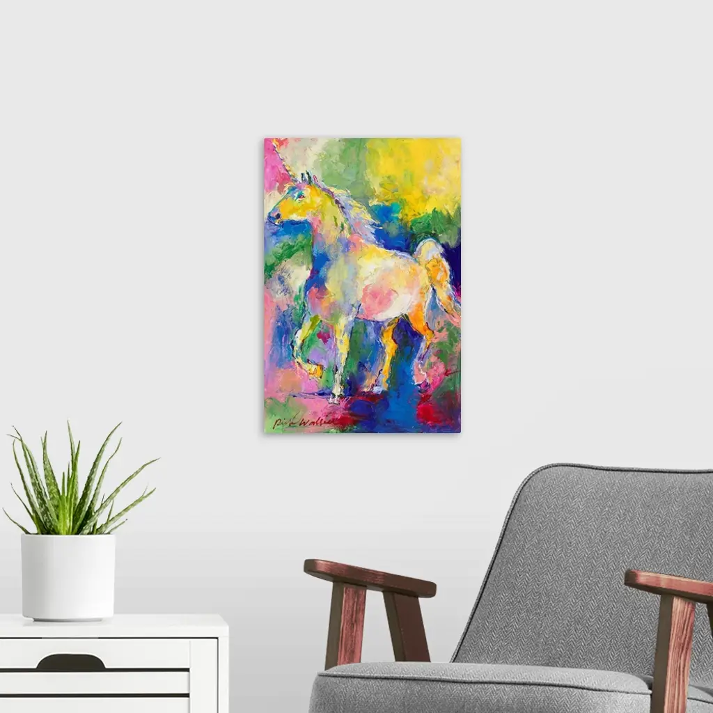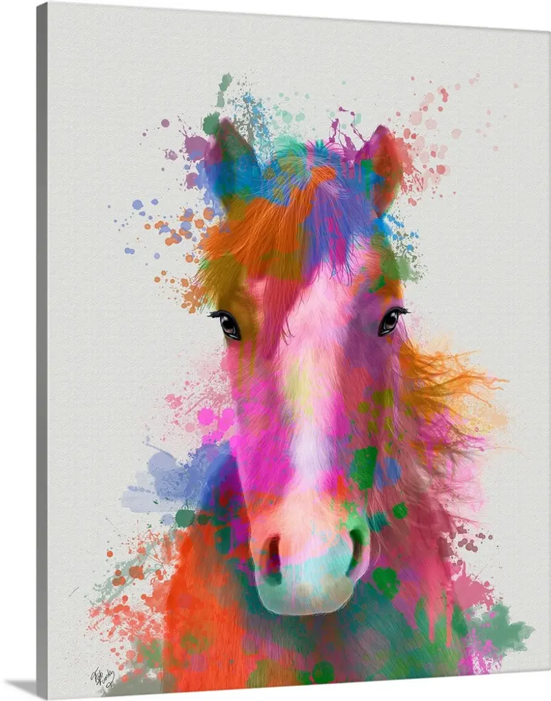 Abstract painting of a colorful unicorn using all of the colors of the rainbow.