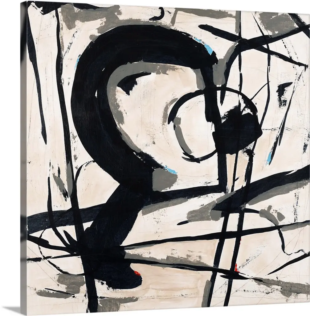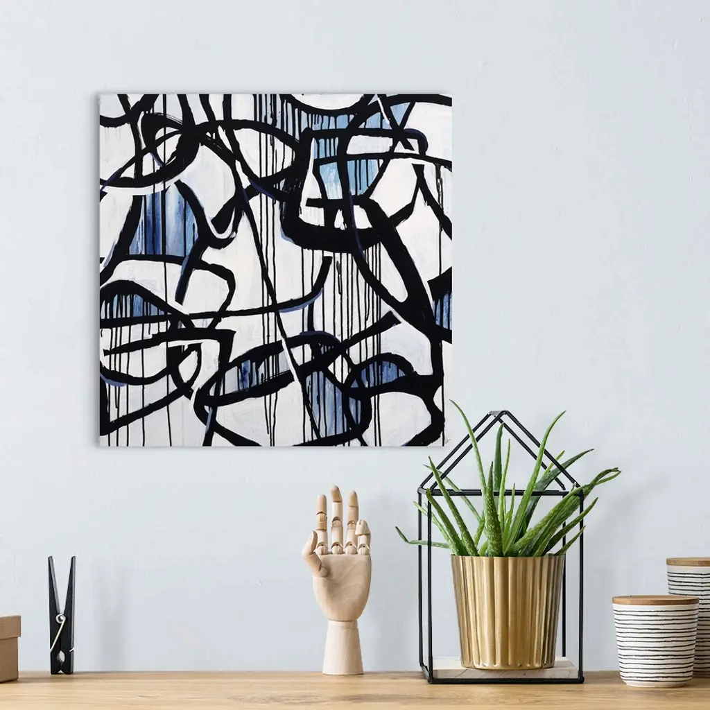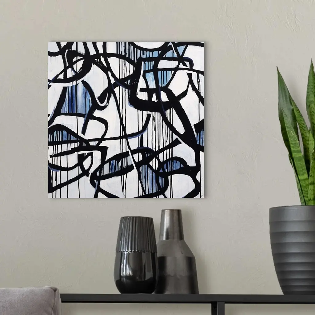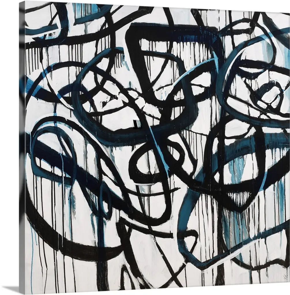Contemporary high contrast abstract painting using deep black organic lines in a circular motion, with hints of blue.
