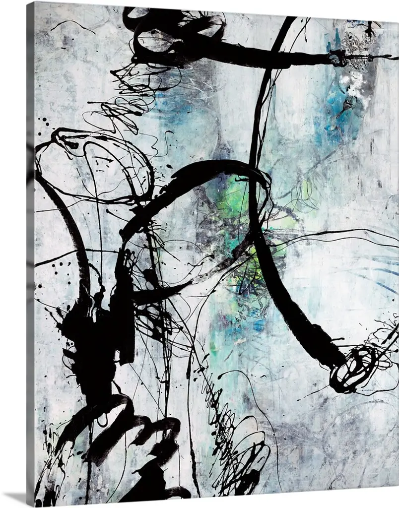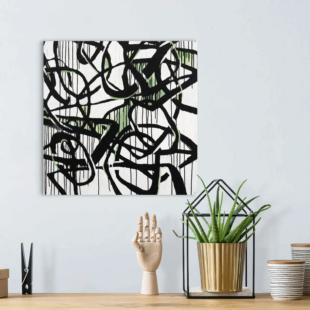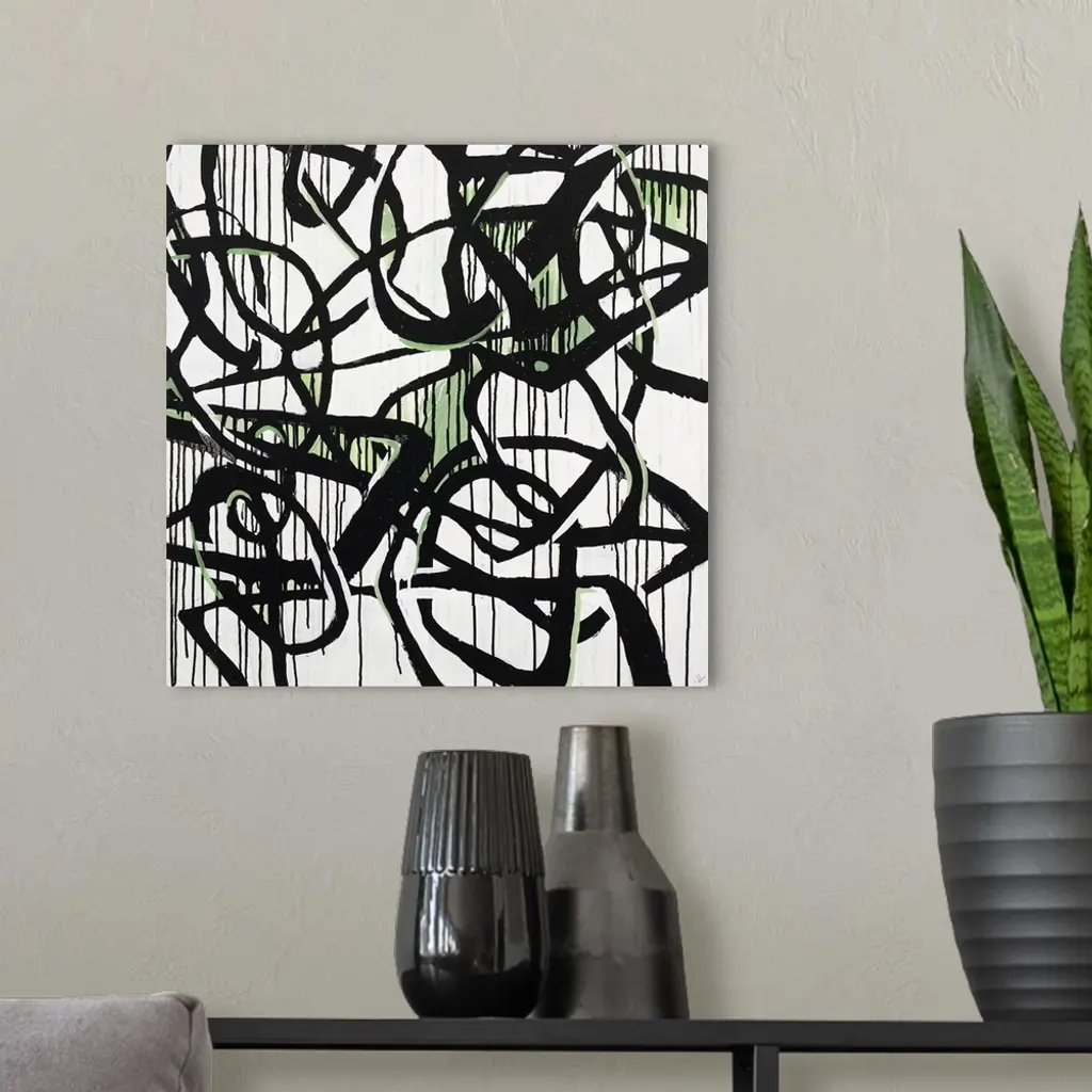 Contemporary high contrast abstract painting using deep black organic lines in a circular motion, with hints of green.