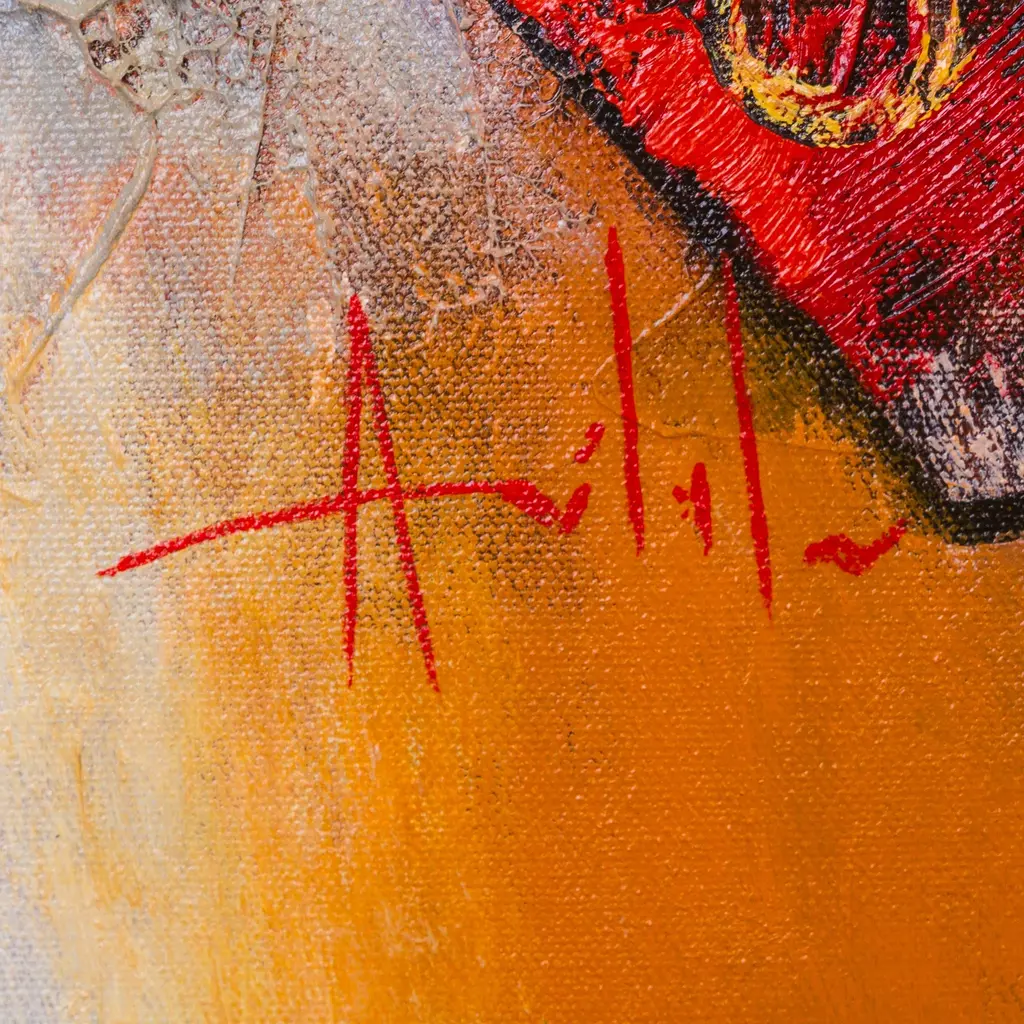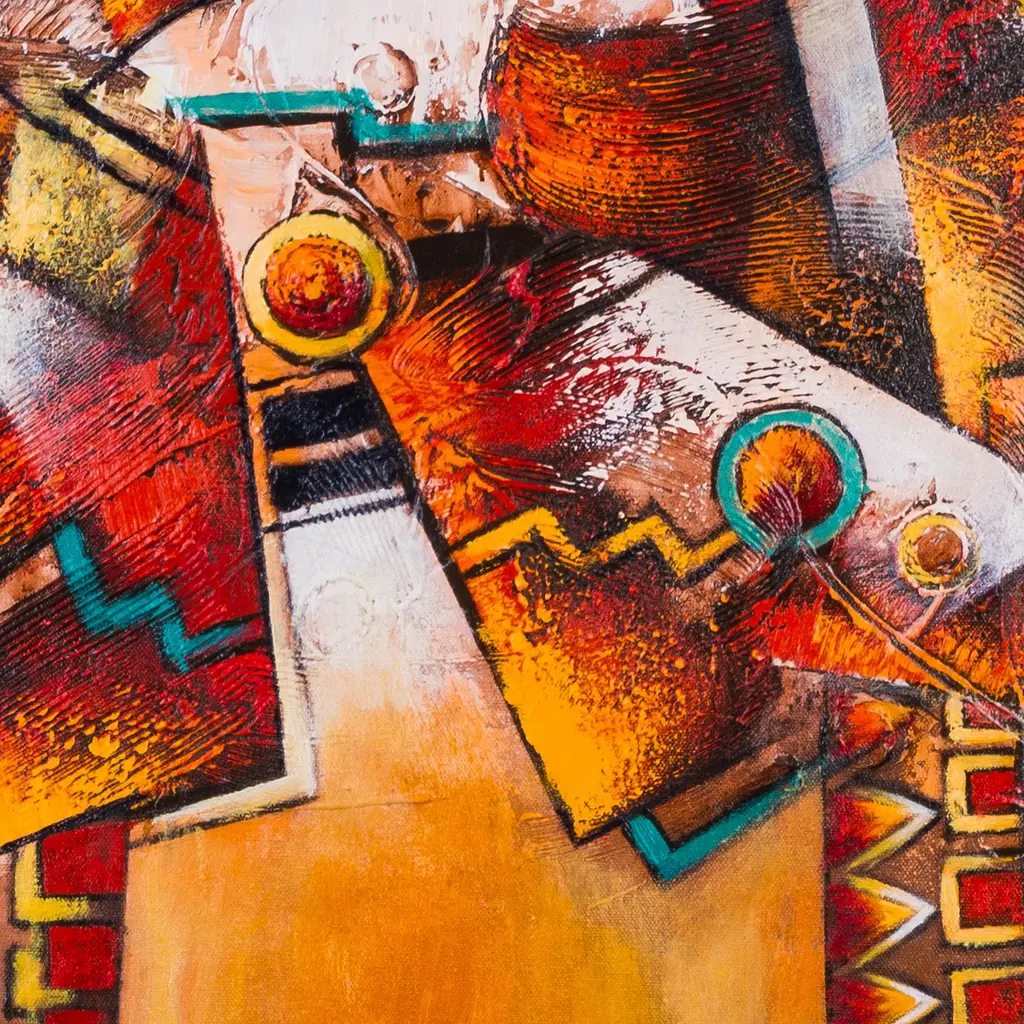 Working in the abstract style, Peruvian artist Carlos Lopez Avila paints using brown and golden colors, depicting a variety of shapes, textures, and emotions that communicate his vision with the viewer. For this piece, the artist draws inspiration from the ancient Tallán people, who survived in Latin American before and after the Spanish Conquest.Titled "Mitología Tallán" in Spanish.