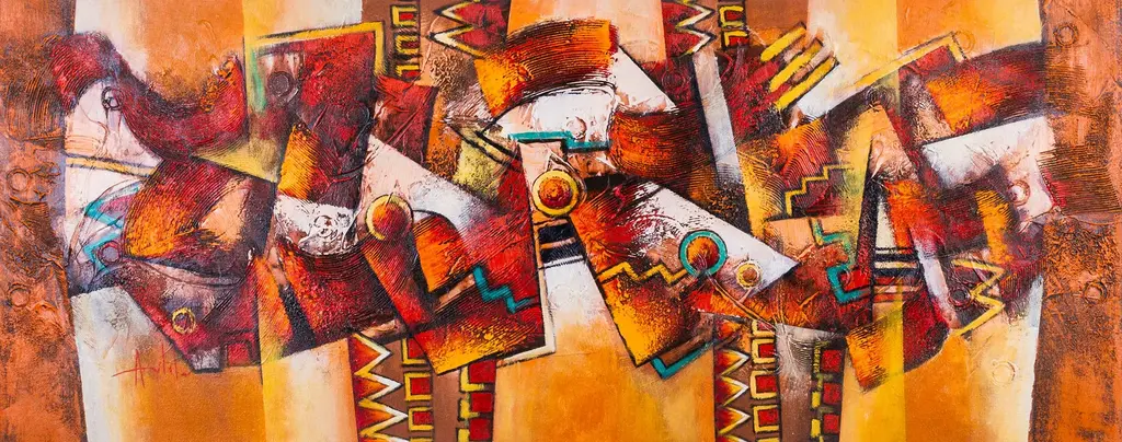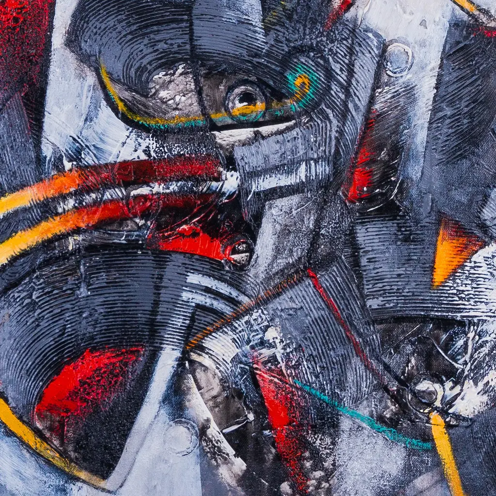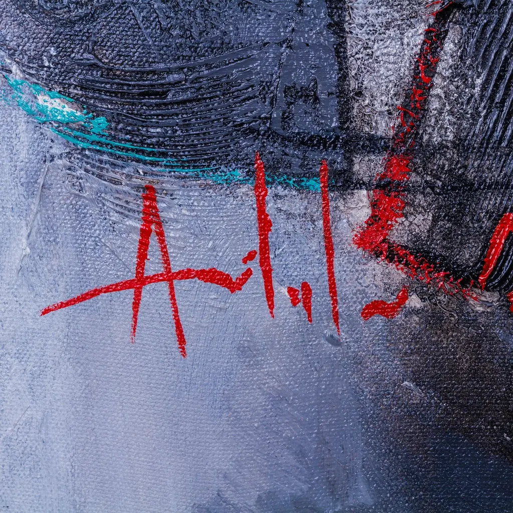 Abstract shades of grey and red dance and weave across the canvas in this oil painting. Peruvian artist Carlos Lopez Avila transmits the visions of his soul to the viewer, painting with broad, textured strokes that reflect his emotions. He paints this piece with inspiration from the Tallán people, an ancient Latin American people that lived their lives by the sea.