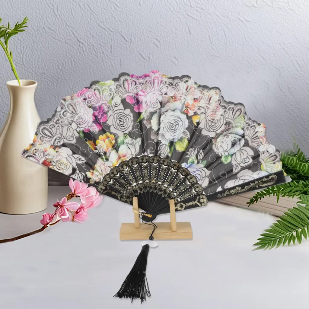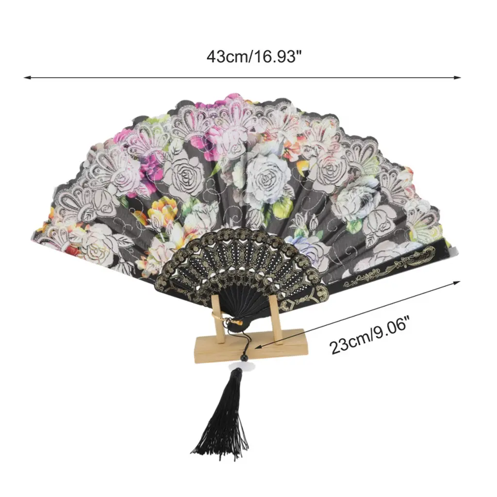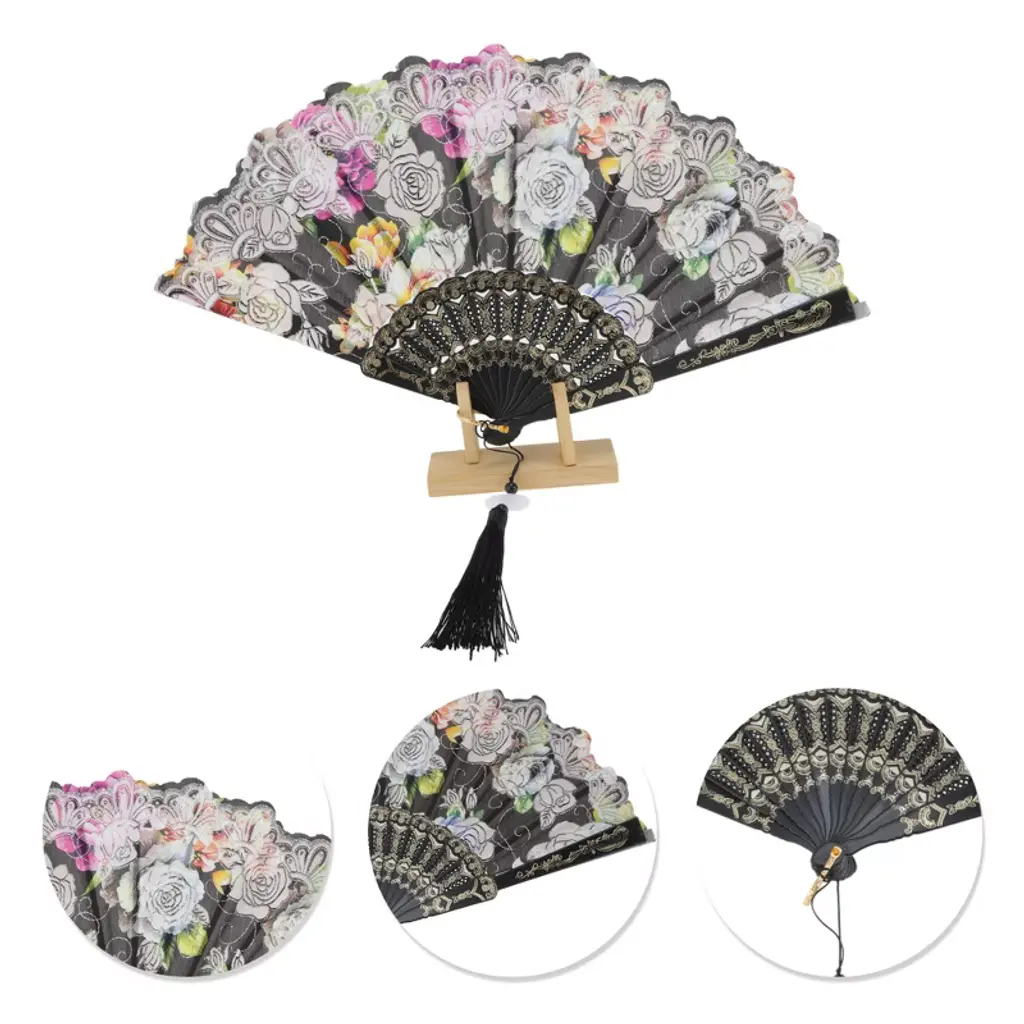 Unique Bargains Rose Print With Tassel Folding Fan Black 1 Pc