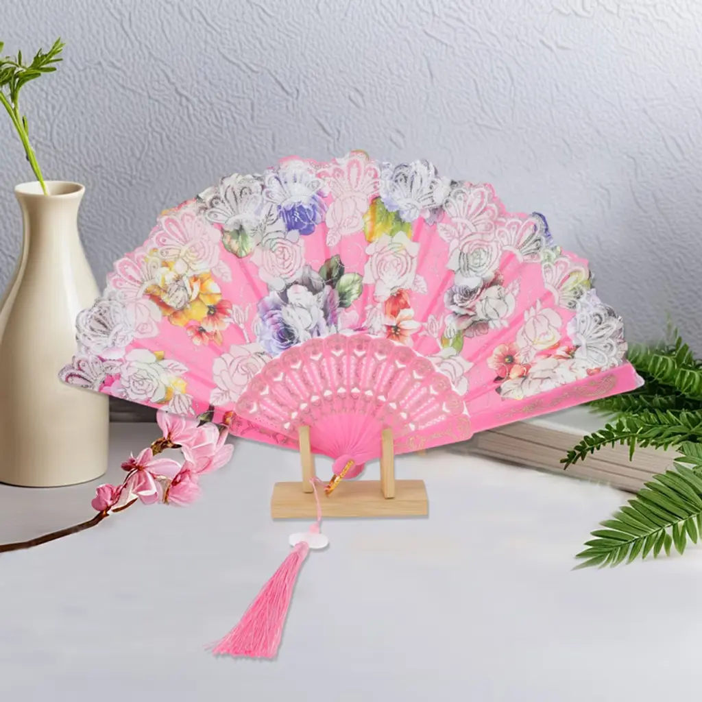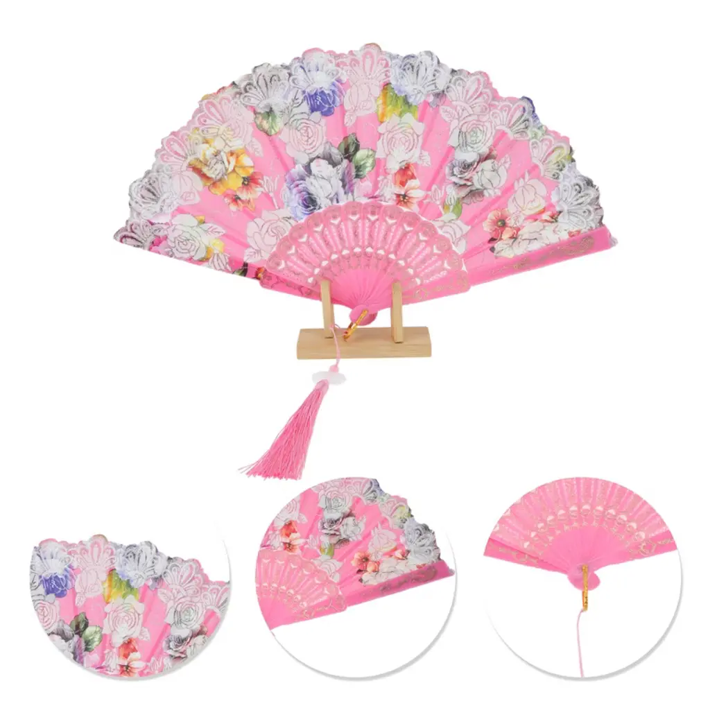 Unique Bargains Rose Print With Tassel Folding Fan Pink 1 Pc