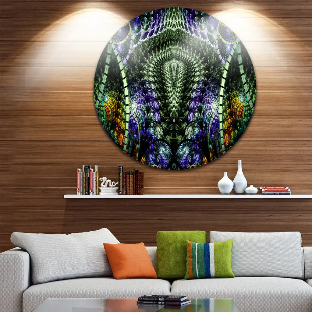 Bring Contemporary Abstraction to your home with this large Circle Metal wall art. This Unique Colorful Fractal Design Pattern Metal Artwork makes it the focal point of any room or office. - White Gloss Coating ensures colors are extra vibrant with light reflection.- Aluminum grade Sheet Metal with 1 inch mounting frame on the back giving the illusion that the artwork is floating on the wall..- Mounting Brackets are included along with instructions.- High Quality Digital images are created directly into a glossy aluminum panel producing a stunning and captivating print into the glossy finish of the metal.- Water, Fire and Scratch resistant HD Aluminum panels.- Looks better than any photo paper and guaranteed to last at least 20 years- Easy to clean with a microfiber cloth. Colors are far superior to regular Canvas Art. - Easy to Hang
