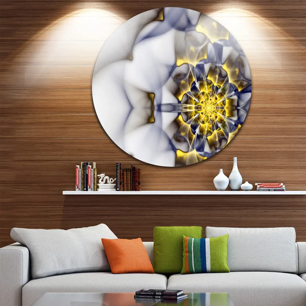 Bring Contemporary Abstraction to your home with this large Circle Metal wall art. This Unique Gold and White Fractal Flower Metal Artwork makes it the focal point of any room or office. - White Gloss Coating ensures colors are extra vibrant with light reflection.- Aluminum grade Sheet Metal with 1 inch mounting frame on the back giving the illusion that the artwork is floating on the wall..- Mounting Brackets are included along with instructions.- High Quality Digital images are created directly into a glossy aluminum panel producing a stunning and captivating print into the glossy finish of the metal.- Water, Fire and Scratch resistant HD Aluminum panels.- Looks better than any photo paper and guaranteed to last at least 20 years- Easy to clean with a microfiber cloth. Colors are far superior to regular Canvas Art. - Easy to Hang