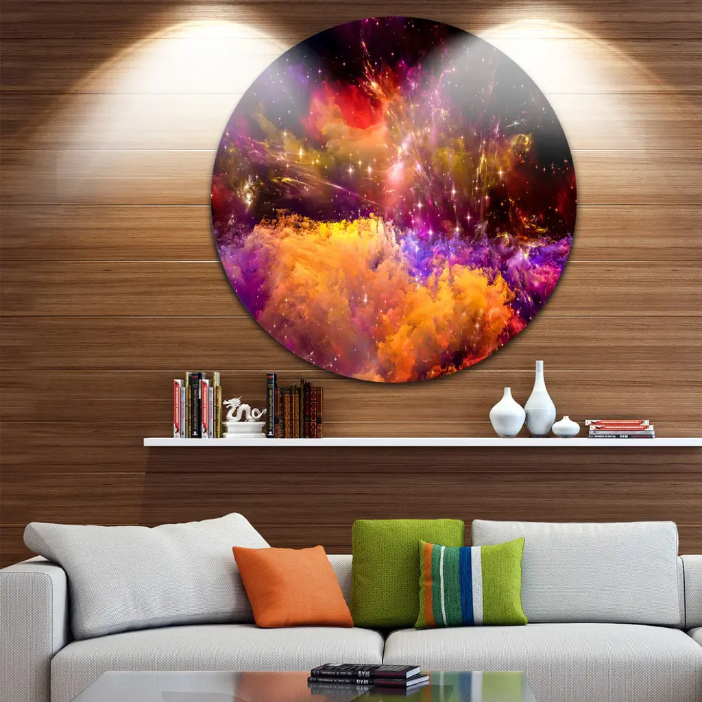 Bring Contemporary Abstraction to your home with this large Circle Metal wall art. This Universe Fractal Burst Metal Artwork makes it the focal point of any room or office. - White Gloss Coating ensures colors are extra vibrant with light reflection.- Aluminum grade Sheet Metal with 1 inch mounting frame on the back giving the illusion that the artwork is floating on the wall..- Mounting Brackets are included along with instructions.- High Quality Digital images are created directly into a glossy aluminum panel producing a stunning and captivating print into the glossy finish of the metal.- Water, Fire and Scratch resistant HD Aluminum panels.- Looks better than any photo paper and guaranteed to last at least 20 years- Easy to clean with a microfiber cloth. Colors are far superior to regular Canvas Art. - Easy to Hang