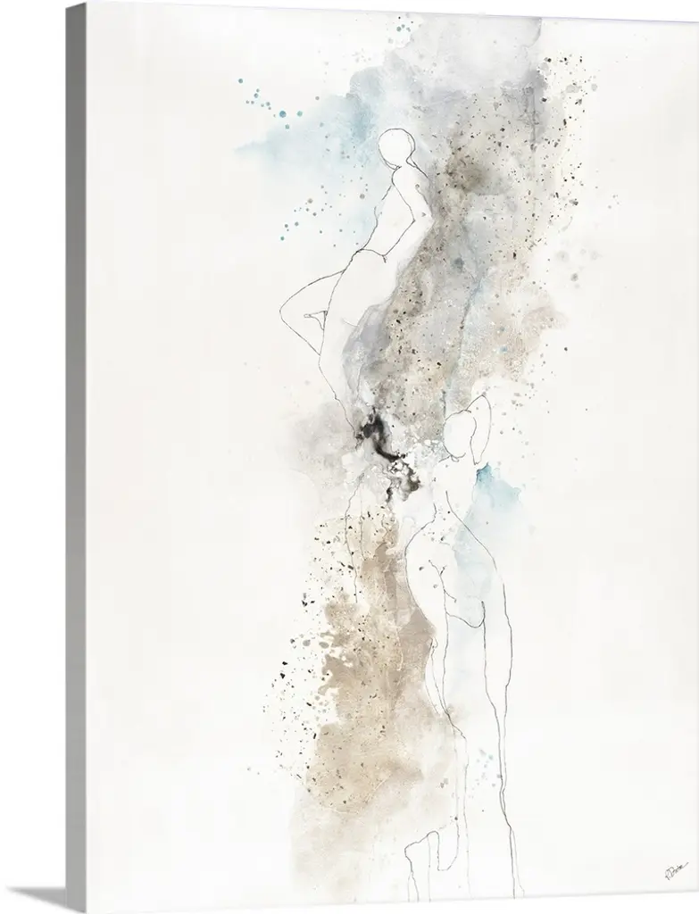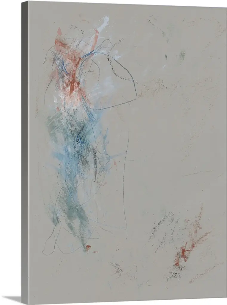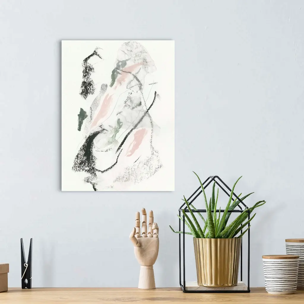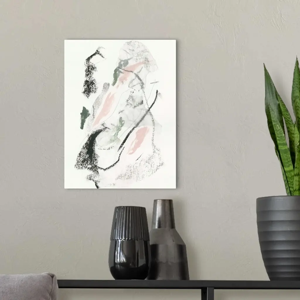 Abstract painting of watercolor and pastels, in random curved lines, of black, pink and gray.