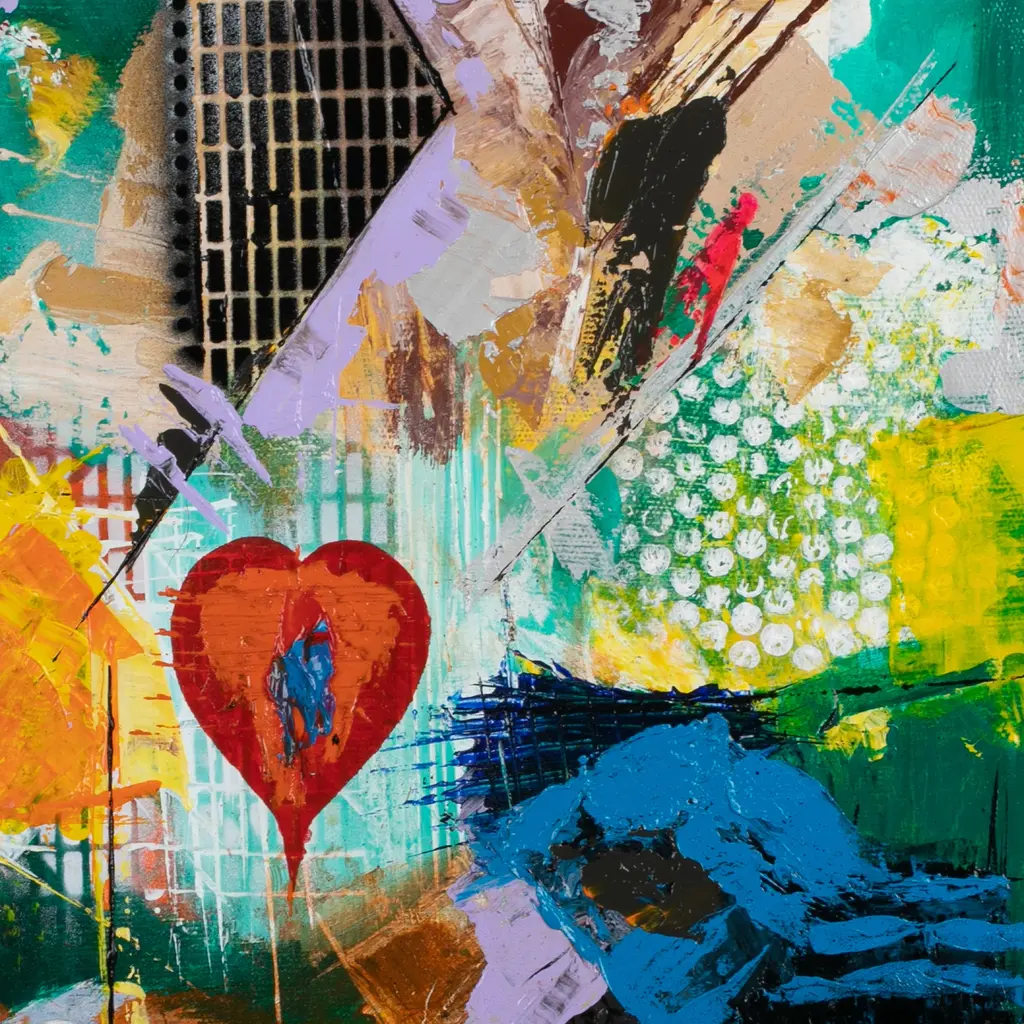 Each mind is a unique realm, and artist Pramono Hadi invites you to love your inner world with this vibrant abstract painting from the Javanese island. Made in canvas, intense green, red, yellow, brown and blue hues converge in a series of elements united by a big heart.The composition arrives signed and unstretched.