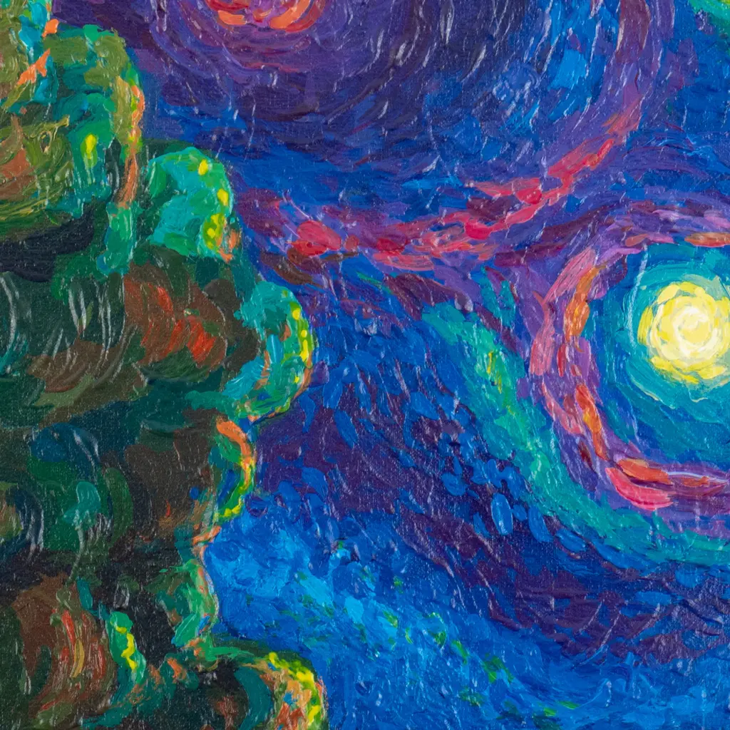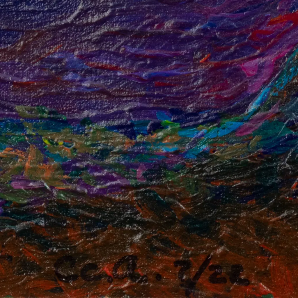 A palette of cool and dark hues illustrates the beauty of nature at night in an expressionist scene by Bruno Ccopa from Peru. Using windy brushstrokes, the artist creates this acrylic painting depicting a lonely tree facing the blue clouds and shiny stars, creating a magical vibe around the piece.The artwork—titled Árbol ante la noche in Spanish—comes signed and unstretched.
