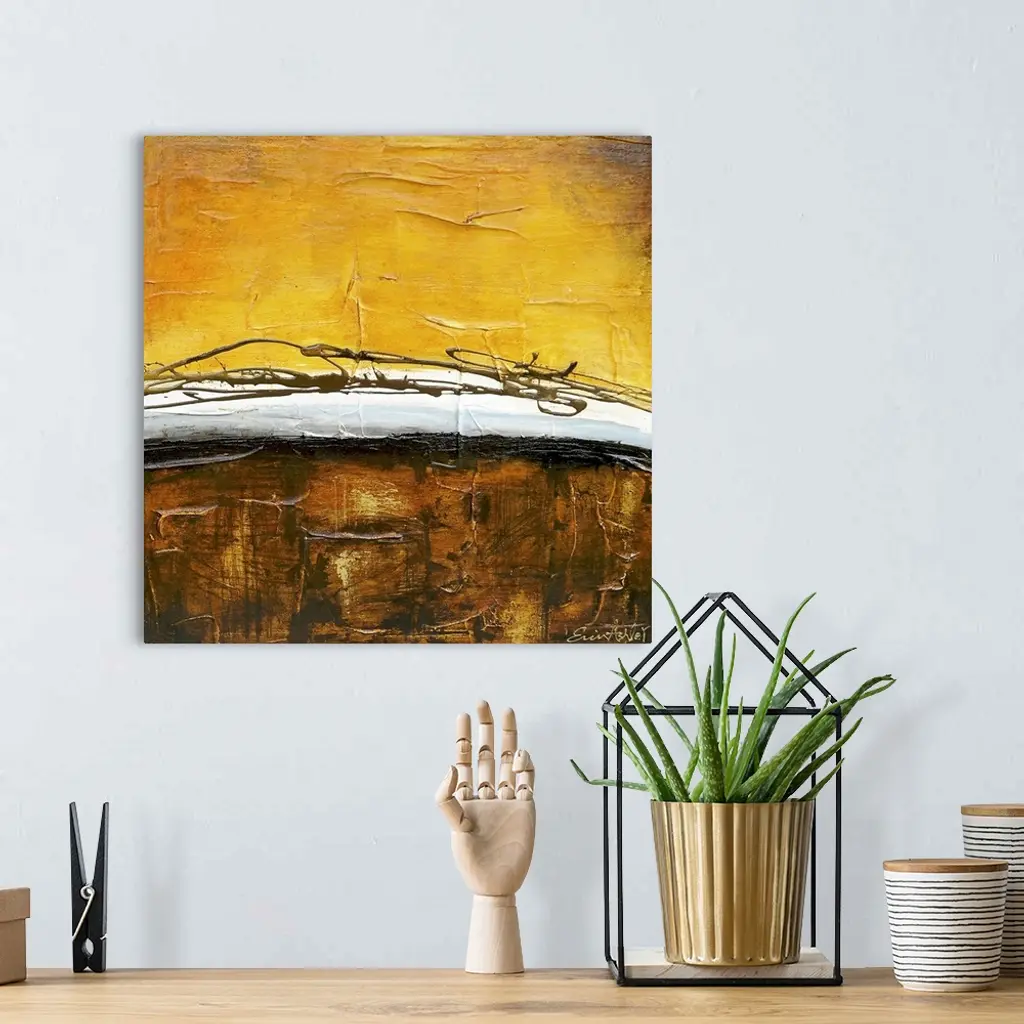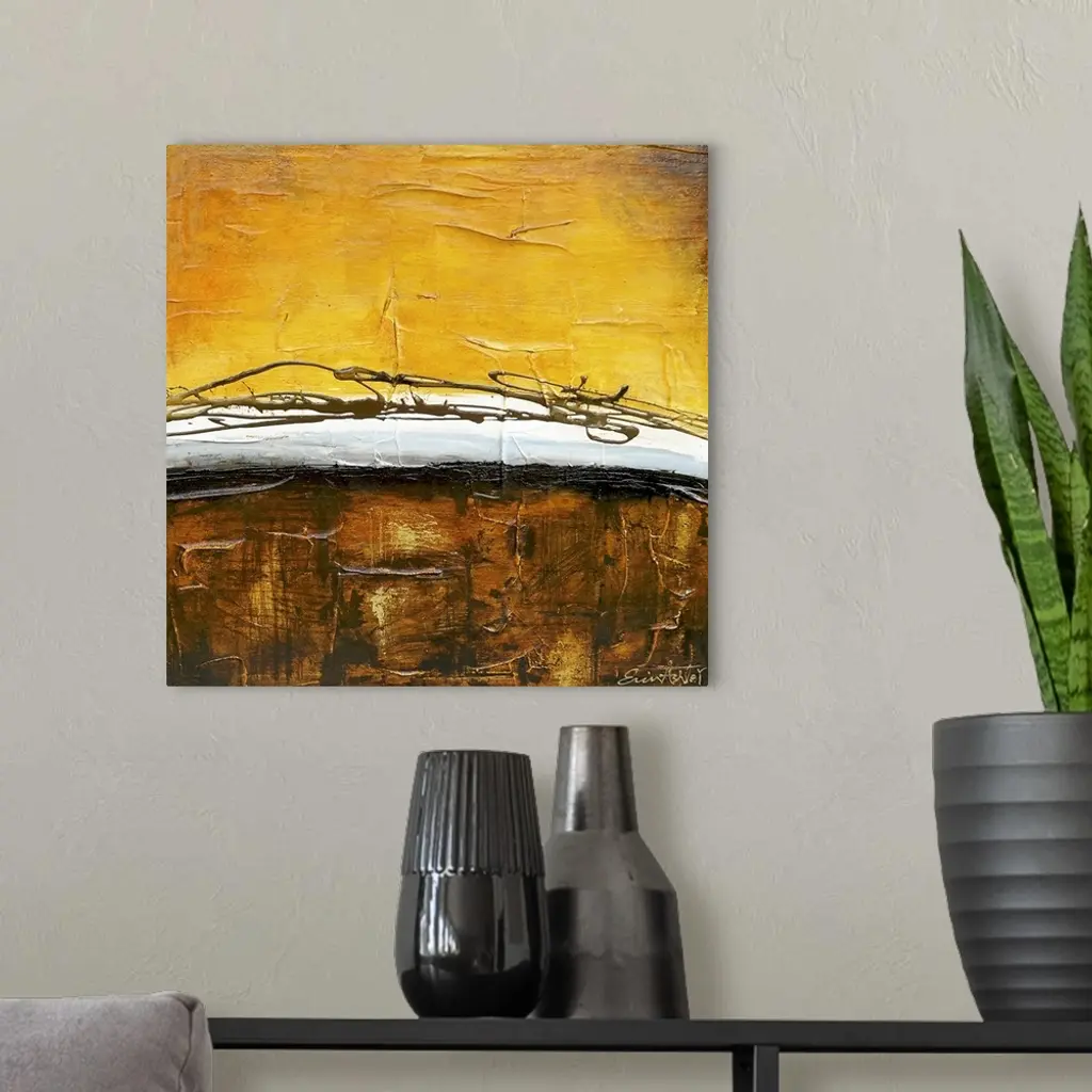 Large wall docor painting of grungy brush strokes at the bottom and thick paint lines dripped on top of a transition of dark warm colors to light towards the top.