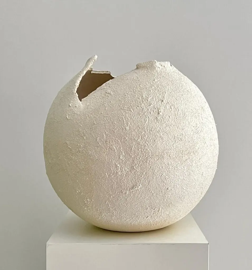Untitled 40 by Laura PasquinoOne of a kindDimensions: D 38 cm x H 38 cmMaterial: Porcelain. Laura PasquinoIncorporating references from ancient Korean ceramics as well as principles of Japanese aesthetics of wabi-sabi, I am led by experimentation with the pure shape of the sphere. My works, which include both functional vessels and sculptures, are each infused with precious imperfections and minimalist aesthetic. The clay, often coarse and textured, is sculpted, hand-built or wheel-thrown to create a wide range of effects and surfaces.My work embraces simplicity, asymmetry and beauty in understated. The dents and scars add subtle grace and individuality to every piece of work. To honour the raw material of clay, the works are often left unglazed.Each artwork is crafted by hand from natural stoneware clay compound and is one of a kind. My aim is to give character to the piece, rather than trying to make it perfect. I leave my fingerprints and tool marks as they happen during the creation process. It gives soul to the object and is a trace of me from that particular moment. Every artwork comes with a certificate of authenticity from the artist.