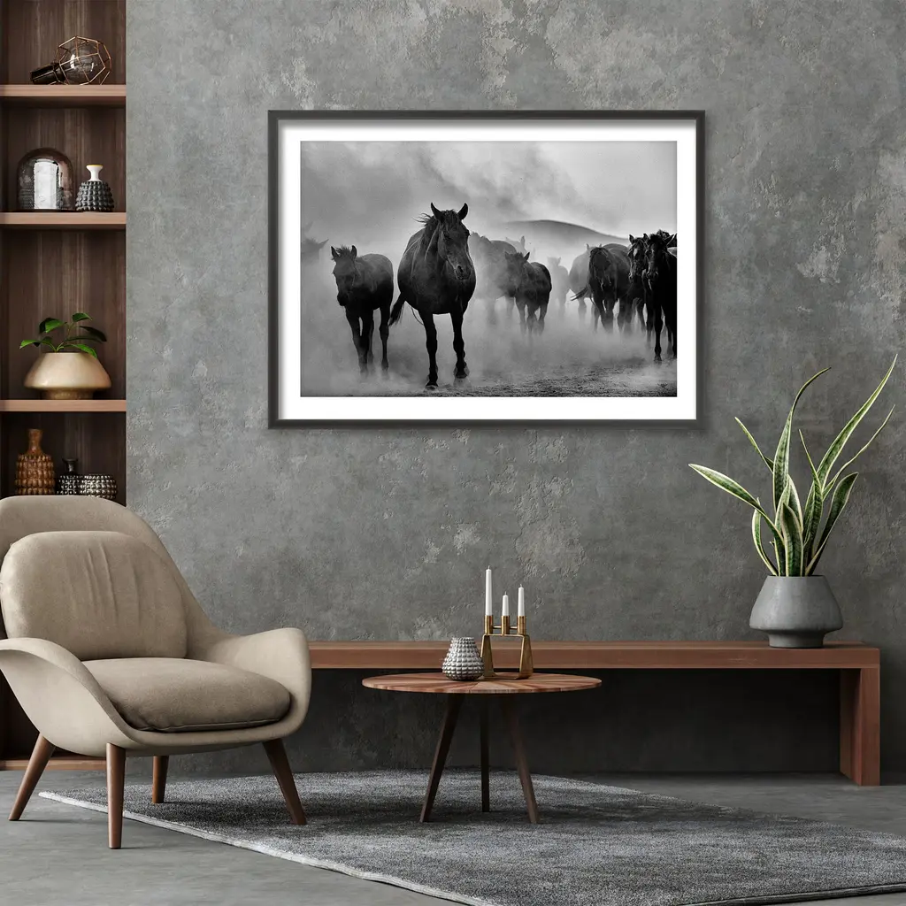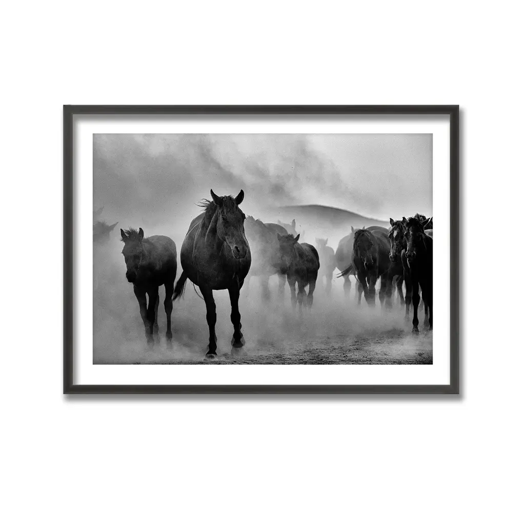 Infuse any space with the essence of this beautifully captured framed print photograph titled "Untitled" by M. Emre Erol. This piece features powerful horses creating dust clouds in monochromatic tones to complete any modern space. Handcrafted in Chattanooga, Tennessee, by Ready2HangArt using a locally sourced artist print, finished with a rear hanger for simple installation.