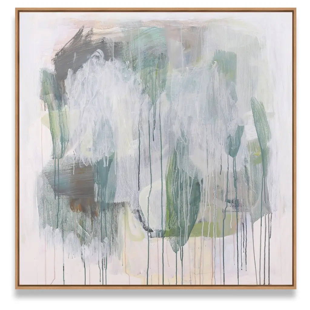 A triumph of bold brushstrokes and dripping fringes with a predominance of greens against a white backdrop distinguishes this abstract painting on canvas from 2022. The generous dimensions, coupled with the use of mixed media, lend it a sense of magnificence attested by the authenticity certificate provided with the painting.