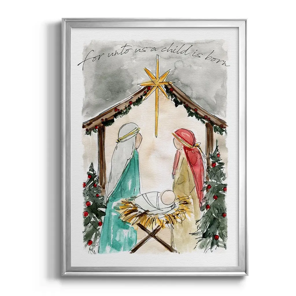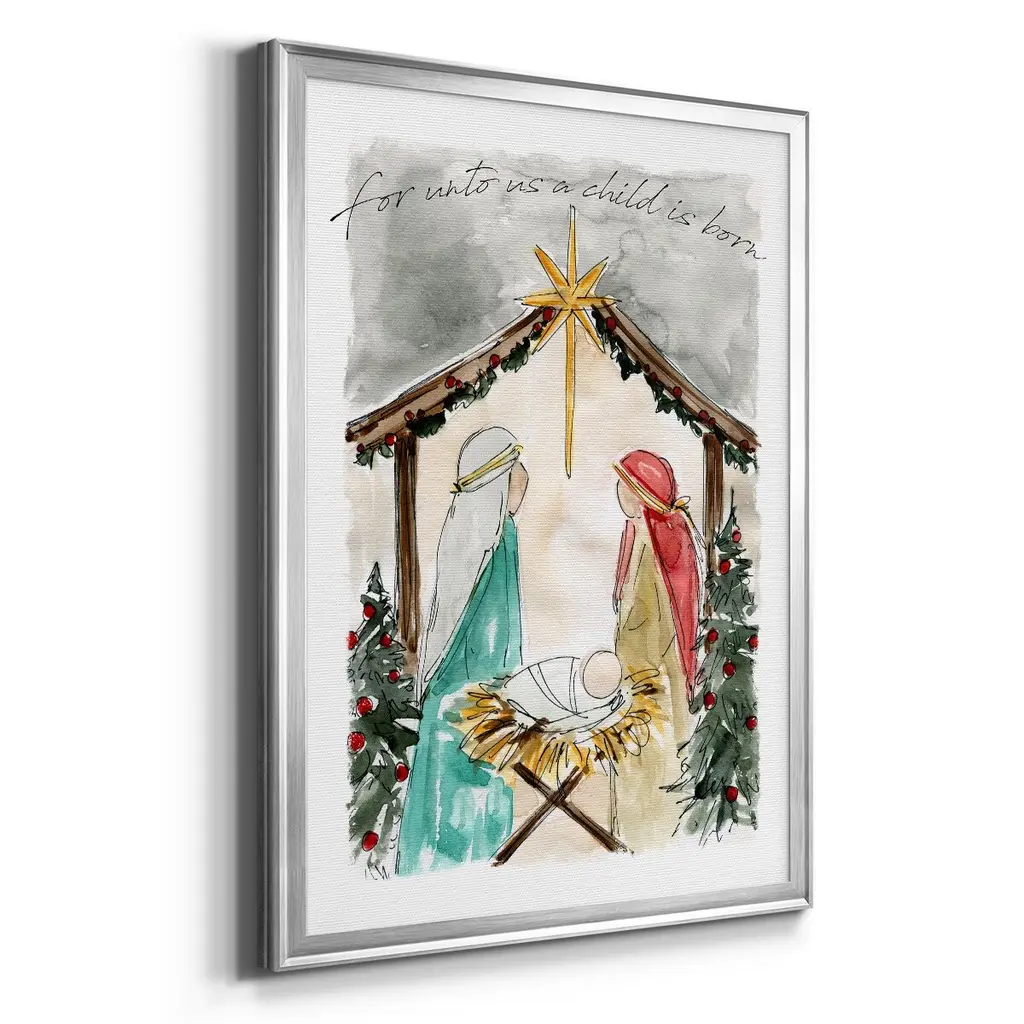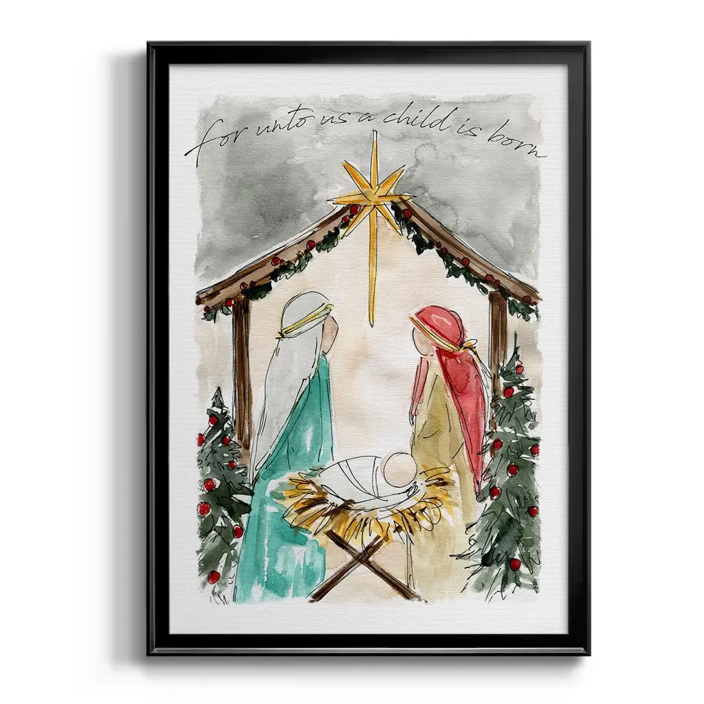 Unto Us A Child is Born Premium Framed Print - Ready to Hang A Premium Framed Print created to last. Framed in distressed wood and available in an array of sizes and colors Featuring a beveled a solid wood stretcher bar, each piece comes ready to hand 4 SIZES AVAILABLE 30.5''X42.5'' - Overall Size 26.5'X36.5'' - Overall Size 22.5''x30.5'' - Overall Size 18.5''x24.5'' - Overall Size Each piece is made to order. Each piece comes with hanging hardware. Made in the USA Ready to Hang