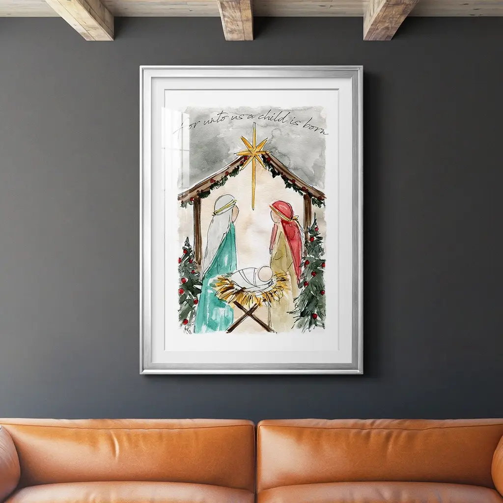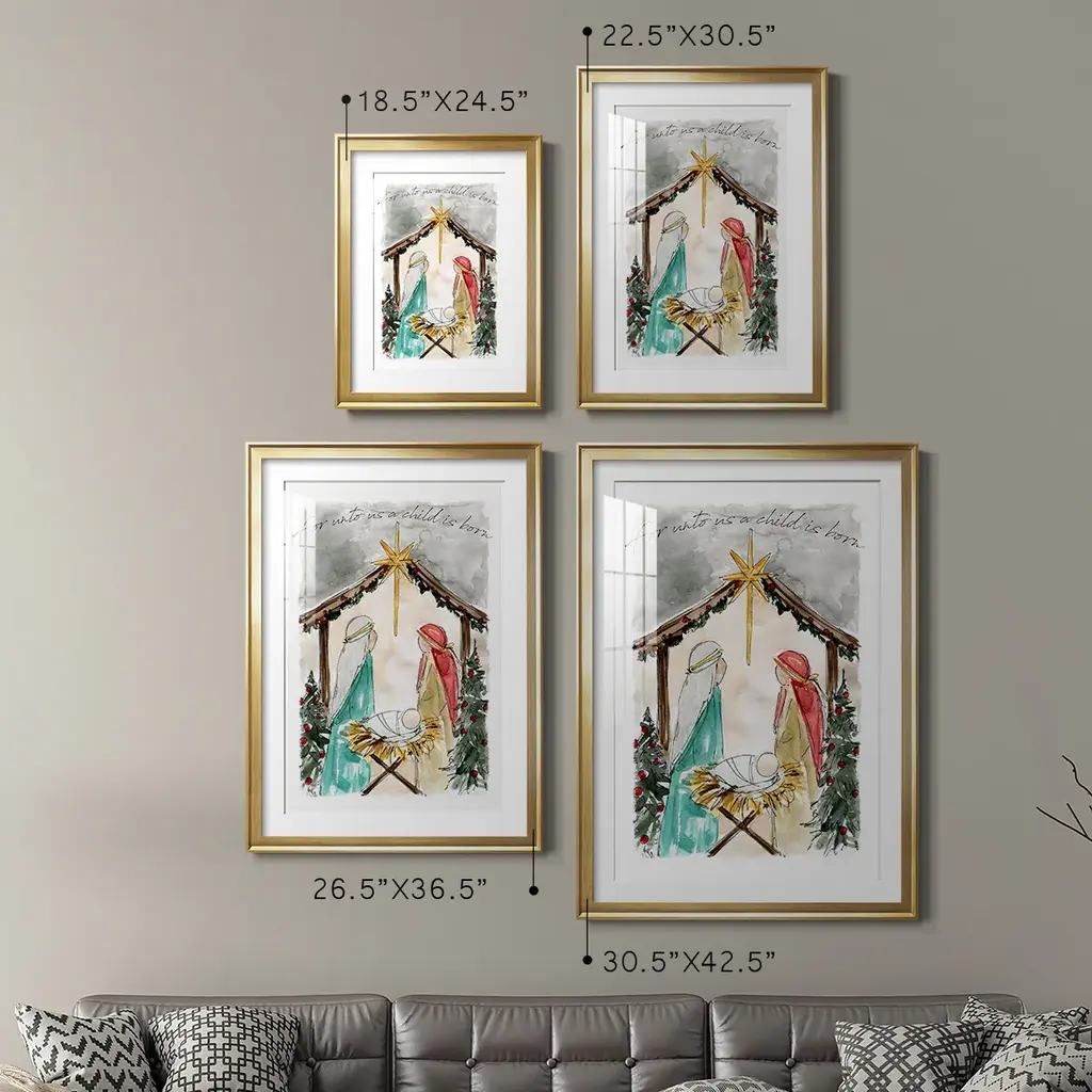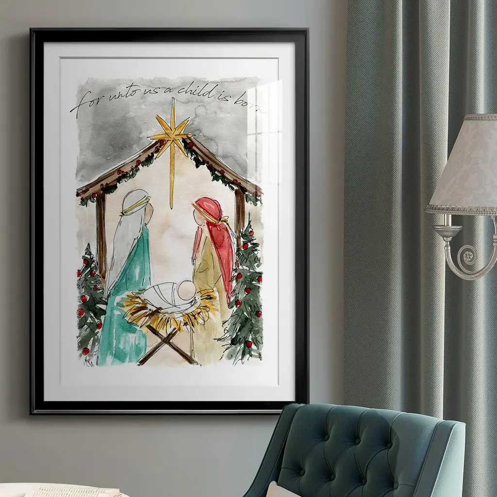 Unto Us A Child is Born Premium Framed Print - Ready to Hang A Premium Framed Print created to last. Framed in distressed wood and available in an array of sizes and colors Featuring a beveled a solid wood stretcher bar, each piece comes ready to hand 4 SIZES AVAILABLE 30.5''X42.5'' - Overall Size 26.5'X36.5'' - Overall Size 22.5''x30.5'' - Overall Size 18.5''x24.5'' - Overall Size Each piece is made to order. Each piece comes with hanging hardware. Made in the USA Ready to Hang Giclee Paper Print Acrylic Glass Beveled Matt Board