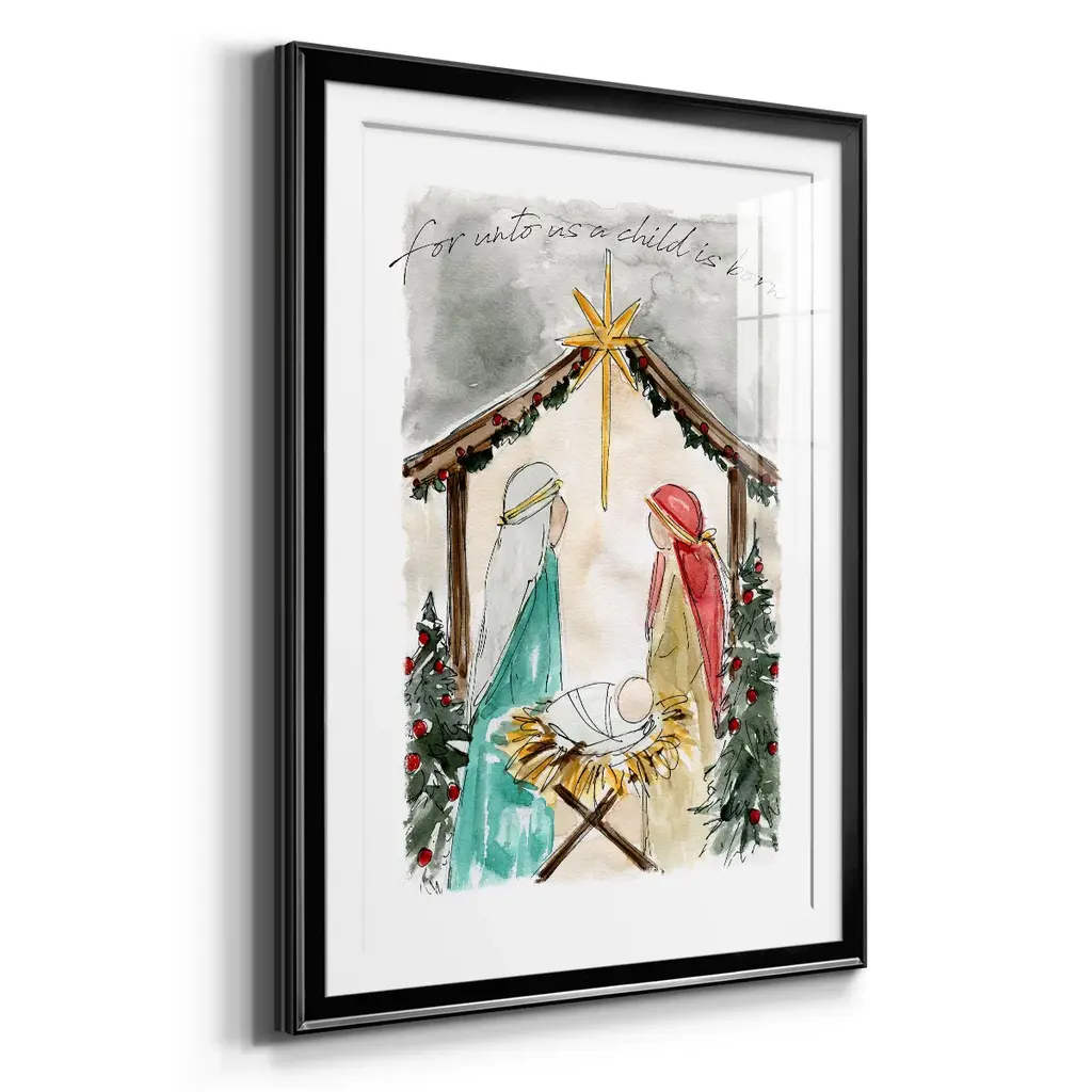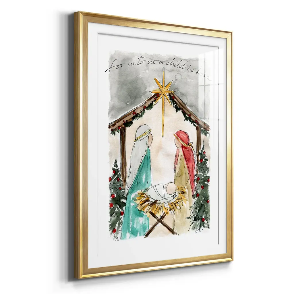 Unto Us A Child is Born Premium Framed Print - Ready to Hang A Premium Framed Print created to last. Framed in distressed wood and available in an array of sizes and colors Featuring a beveled a solid wood stretcher bar, each piece comes ready to hand 4 SIZES AVAILABLE 30.5''X42.5'' - Overall Size 26.5'X36.5'' - Overall Size 22.5''x30.5'' - Overall Size 18.5''x24.5'' - Overall Size Each piece is made to order. Each piece comes with hanging hardware. Made in the USA Ready to Hang Giclee Paper Print Acrylic Glass Beveled Matt Board