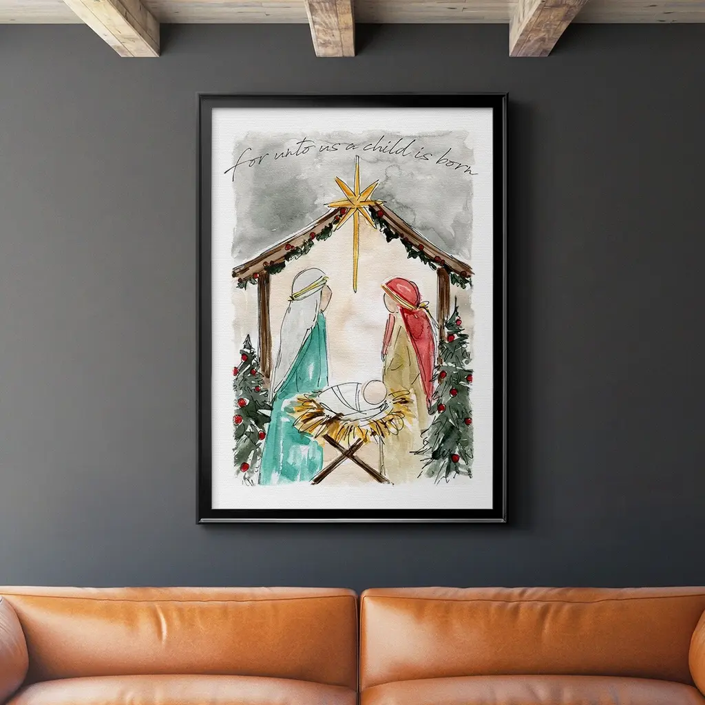 Unto Us A Child is Born Premium Framed Print - Ready to Hang A Premium Framed Print created to last. Framed in distressed wood and available in an array of sizes and colors Featuring a beveled a solid wood stretcher bar, each piece comes ready to hand 4 SIZES AVAILABLE 30.5''X42.5'' - Overall Size 26.5'X36.5'' - Overall Size 22.5''x30.5'' - Overall Size 18.5''x24.5'' - Overall Size Each piece is made to order. Each piece comes with hanging hardware. Made in the USA Ready to Hang