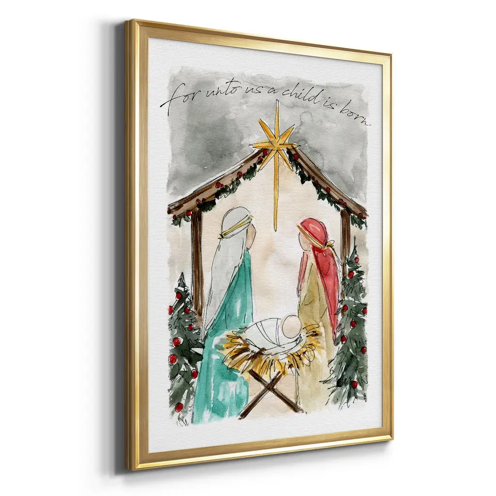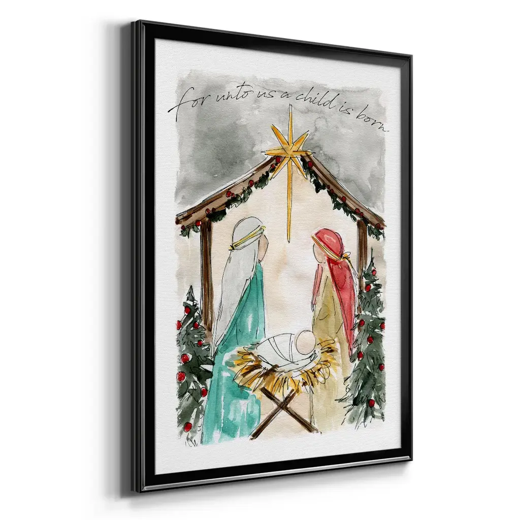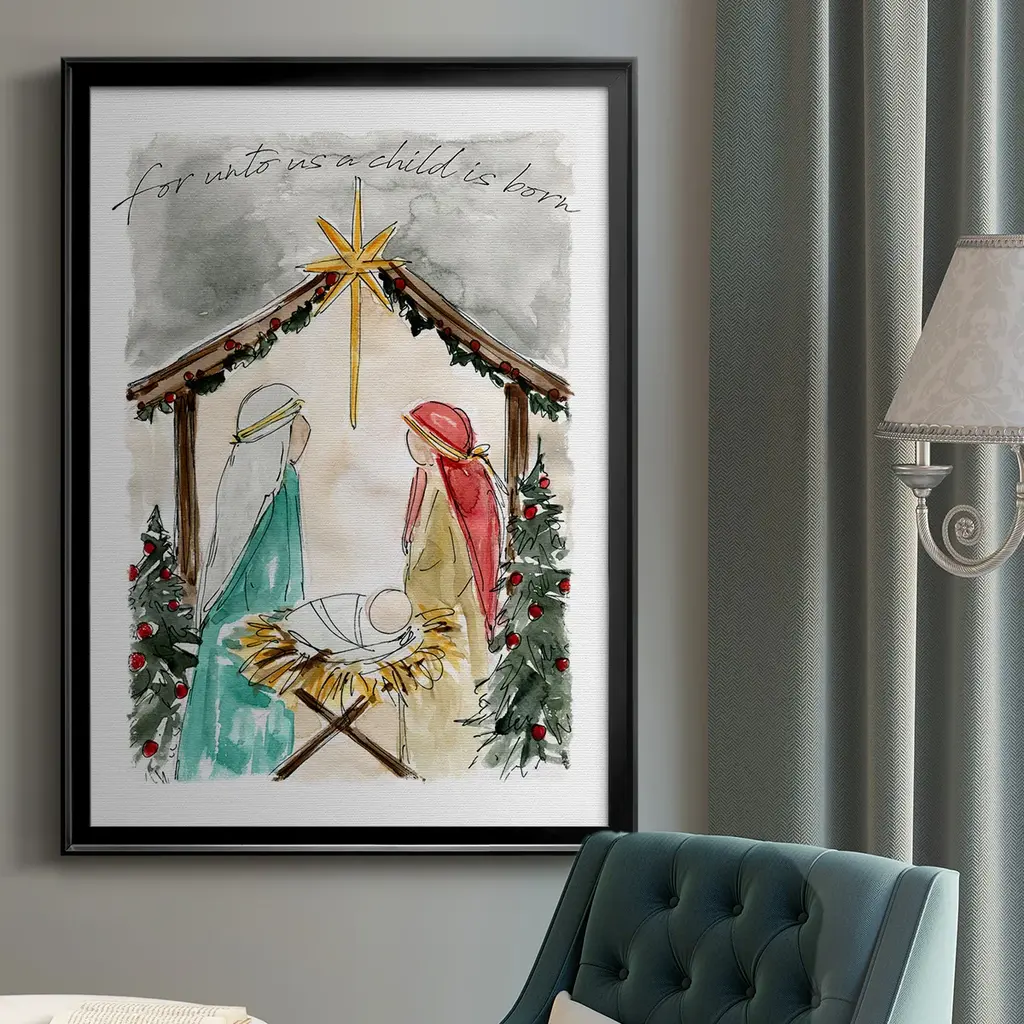 Unto Us A Child is Born Premium Framed Print - Ready to Hang A Premium Framed Print created to last. Framed in distressed wood and available in an array of sizes and colors Featuring a beveled a solid wood stretcher bar, each piece comes ready to hand 4 SIZES AVAILABLE 30.5''X42.5'' - Overall Size 26.5'X36.5'' - Overall Size 22.5''x30.5'' - Overall Size 18.5''x24.5'' - Overall Size Each piece is made to order. Each piece comes with hanging hardware. Made in the USA Ready to Hang